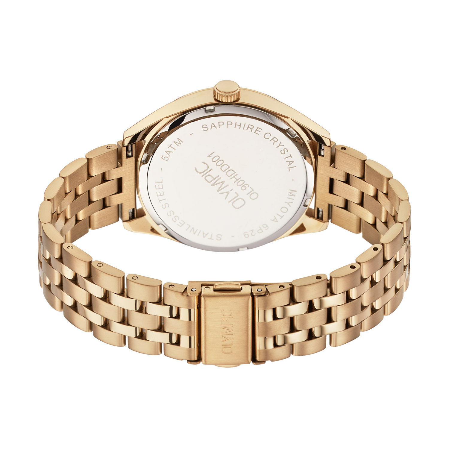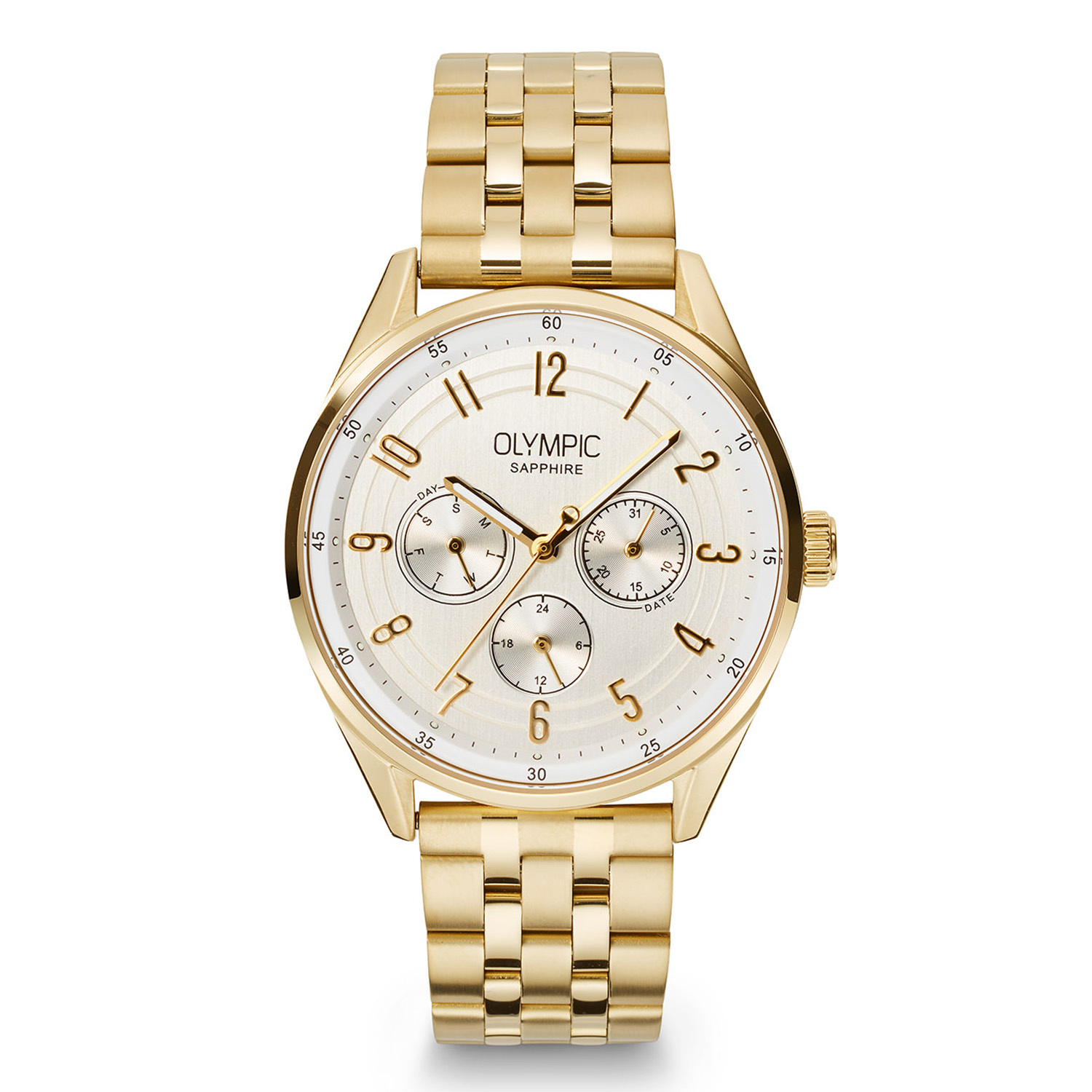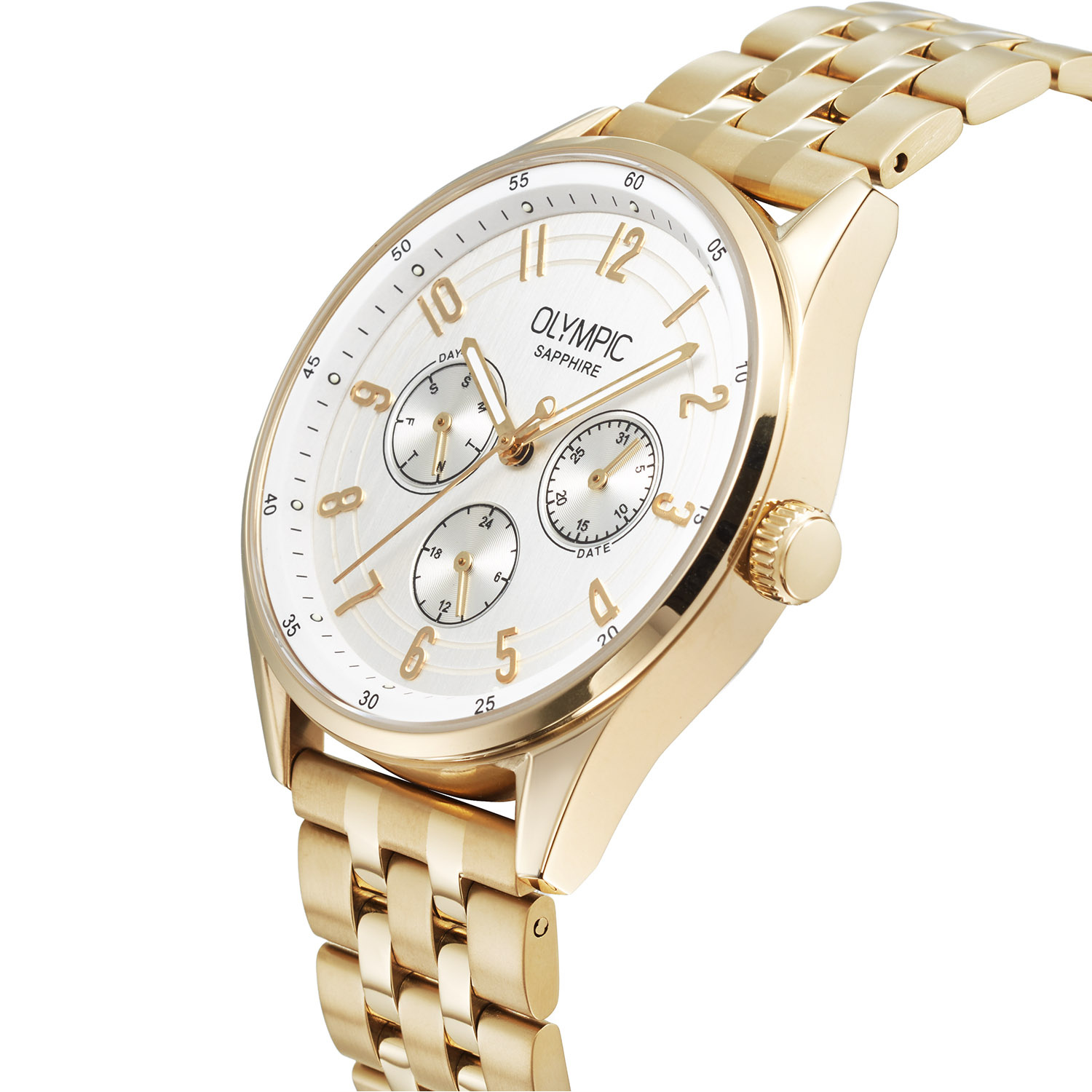 Dit unieke Olympic horloge met artikelnummer: OL90HDD001 is een klassiek herenhorloge. Het horloge heeft een ronde goudkleurige stalen kast met een diameter van 40 mm. De zilverkleurige wijzerplaat met dag- en datumaanduiding en met 24-uursaanduiding zorgt samen met de verzorgde afwerking voor een stijlvolle uitstraling. De goudkleurig stalen schakelband draagt comfortabel en maakt het ontwerp helemaal af.