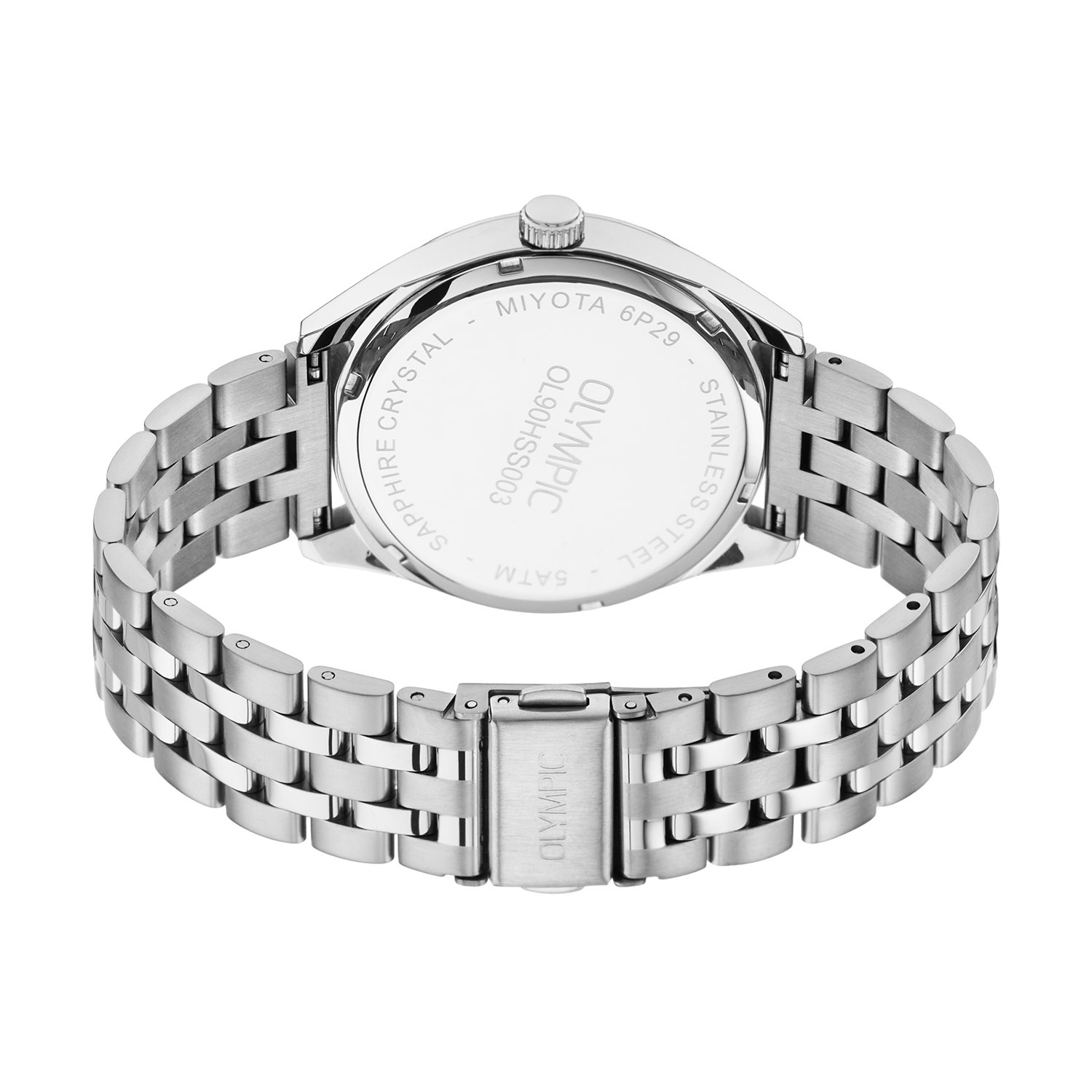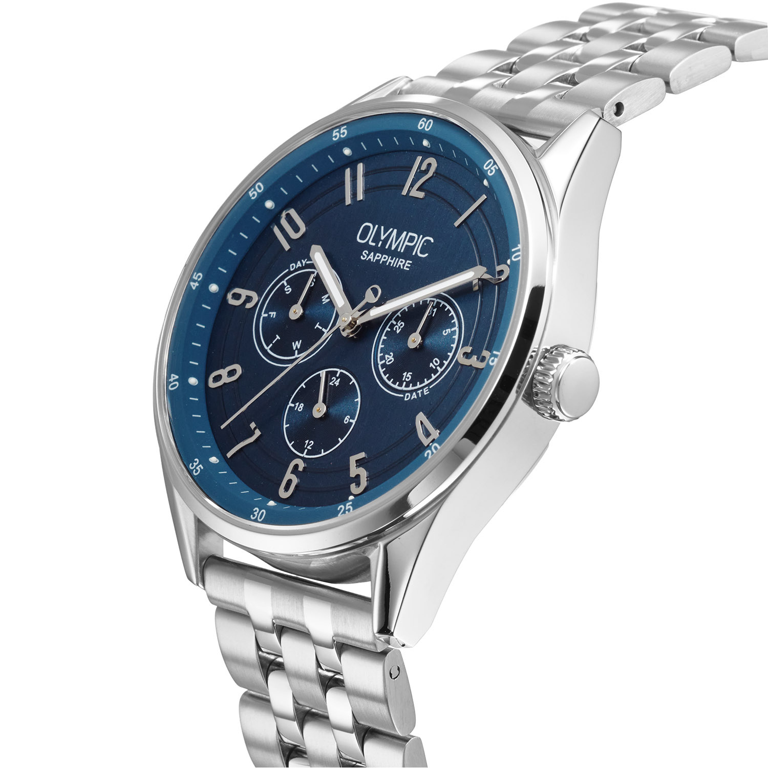 Dit unieke Olympic horloge met artikelnummer: OL90HSS003 is een klassiek herenhorloge. Het horloge heeft een ronde stalen kast met een diameter van 40 mm. De blauwe wijzerplaat met dag- en datumaanduiding en met 24-uursaanduiding zorgt samen met de verzorgde afwerking voor een stijlvolle uitstraling. De stalen schakelband draagt comfortabel en maakt het ontwerp helemaal af.