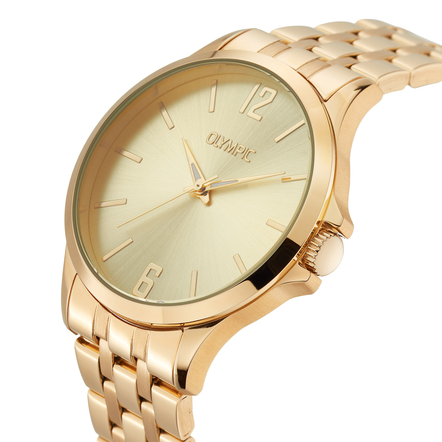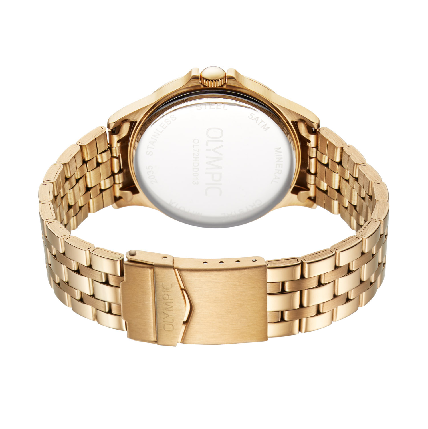 Dit unieke Olympic horloge met artikelnummer OL72HDD013 is een herenhorloge met een classic sportieve uitstraling. Het horloge heeft een ronde goudkleurige stalen kast met een goudkleurige wijzerplaat met de 12 en de 6 in Romeinse cijfers en de andere uursaanduiding in strepen. Aan de kast zit een goudkleurige schakelband met een vouwsluiting. Het horloge heeft een mineraalglas, een doorsnee van 40 mm en is 5 ATM.