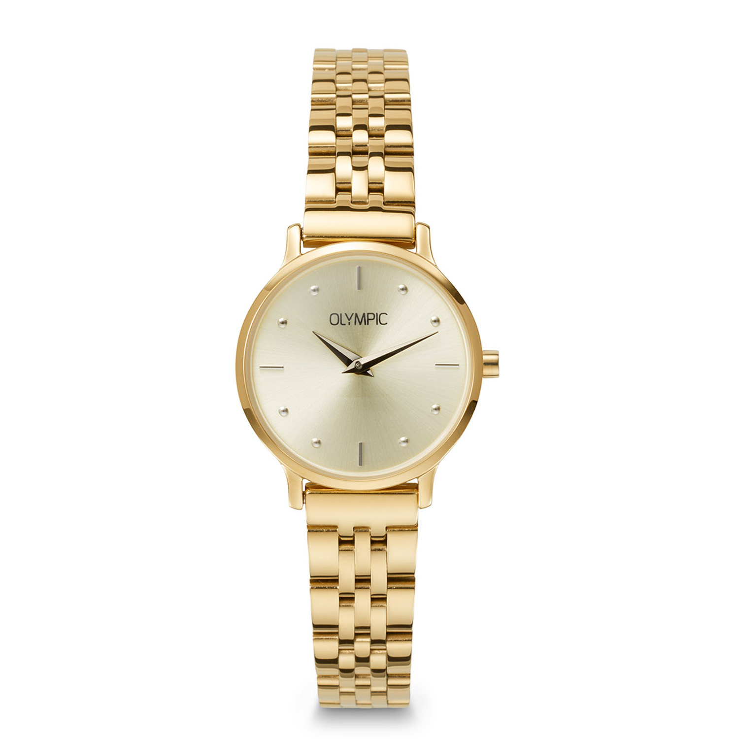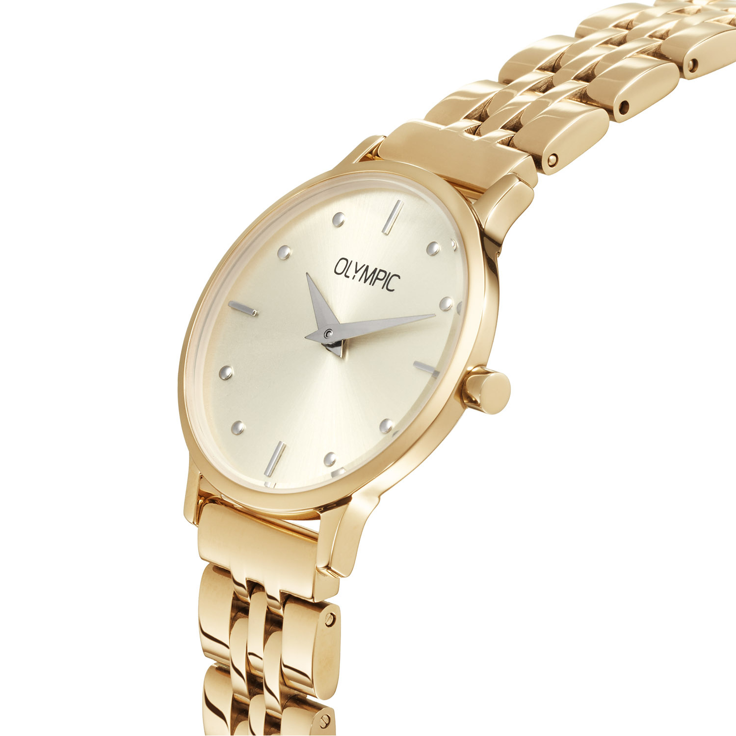 Dit unieke Olympic horloge met artikelnummer: OL82DDD003B is een sportief dameshorloge. Het horloge heeft een ronde goudkleurige stalen kast met een diameter van 26 mm. De goudkleurige wijzerplaat met datumaanduiding zorgt samen met de verzorgde afwerking voor een stijlvolle uitstraling. De goudkleurig stalen schakelband draagt comfortabel en maakt het ontwerp helemaal af.