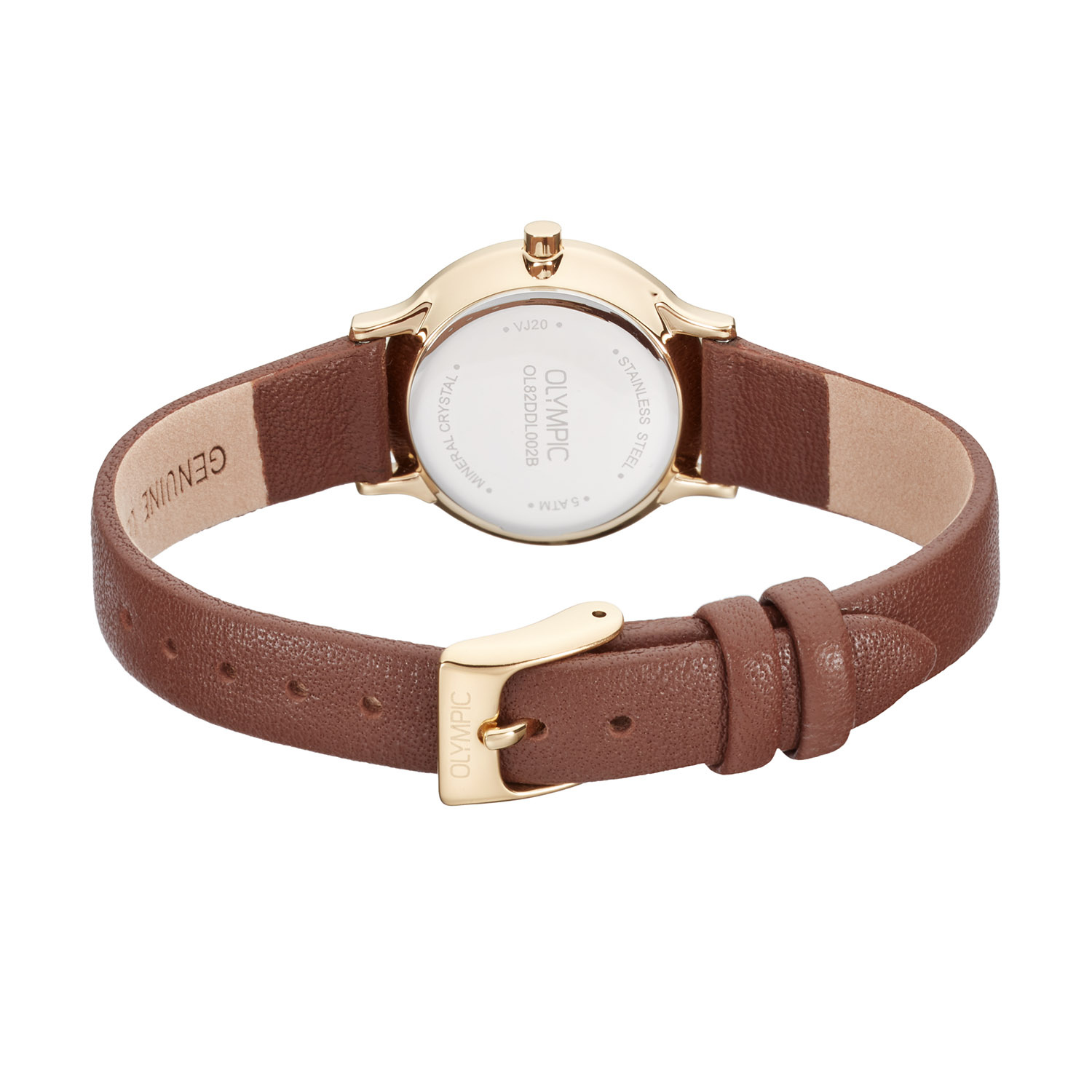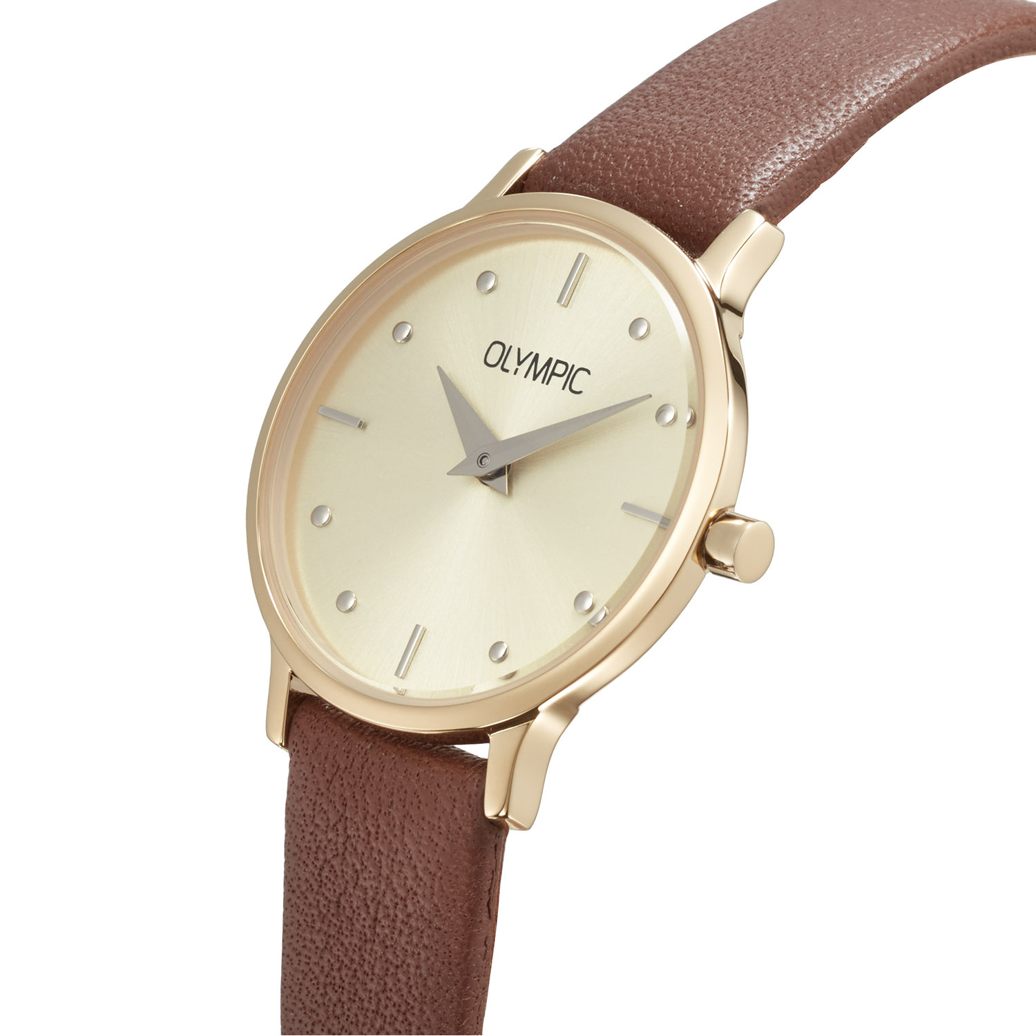 Dit unieke Olympic horloge met artikelnummer: OL82DDL002B is een net dameshorloge. Het horloge heeft een ronde goudkleurige stalen kast met een diameter van 26 mm. De goudkleurige wijzerplaat met datumaanduiding zorgt samen met de verzorgde afwerking voor een stijlvolle uitstraling. De bruin leren band draagt comfortabel en maakt het ontwerp helemaal af.