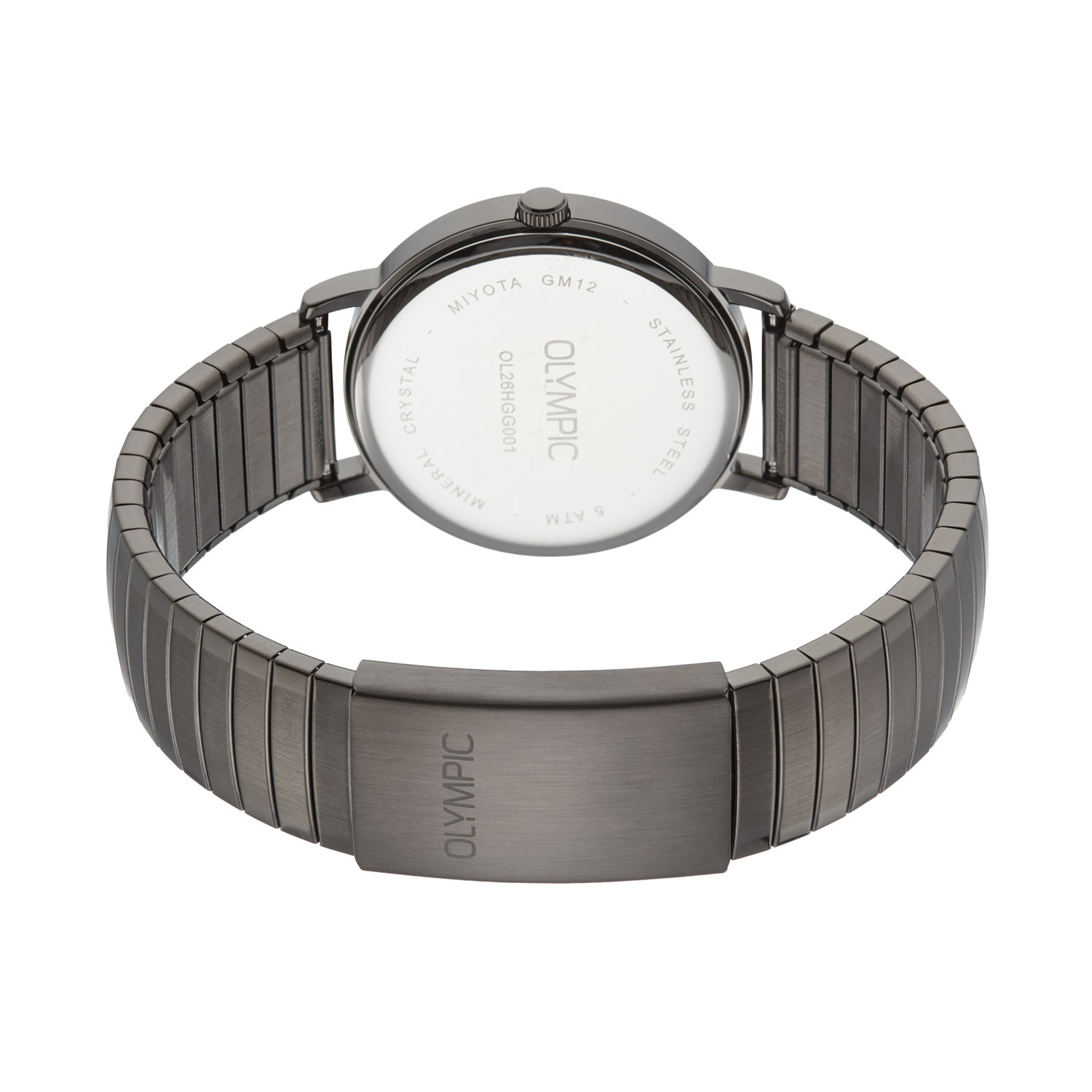 Dit unieke Olympic horloge met artikelnummer OL26HGG001 is een herenhorloge met een classic sportieve uitstraling. Het horloge heeft een ronde stalen gunmetal kast met een bruine wijzerplaat met een datum en lumibrite op de wijzers. Aan de kast zit een stalen mat glanzende gunmetal rekband. Het horloge heeft een mineraalglas, een doorsnee van 37 mm en is 5 ATM.