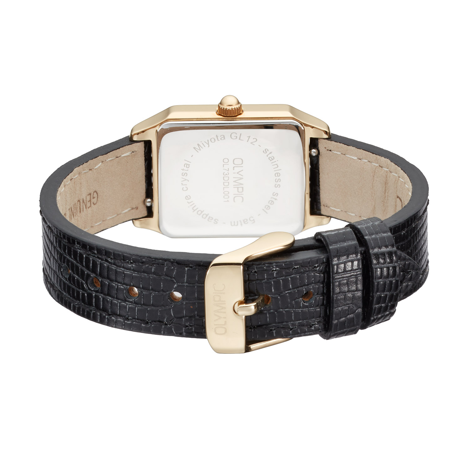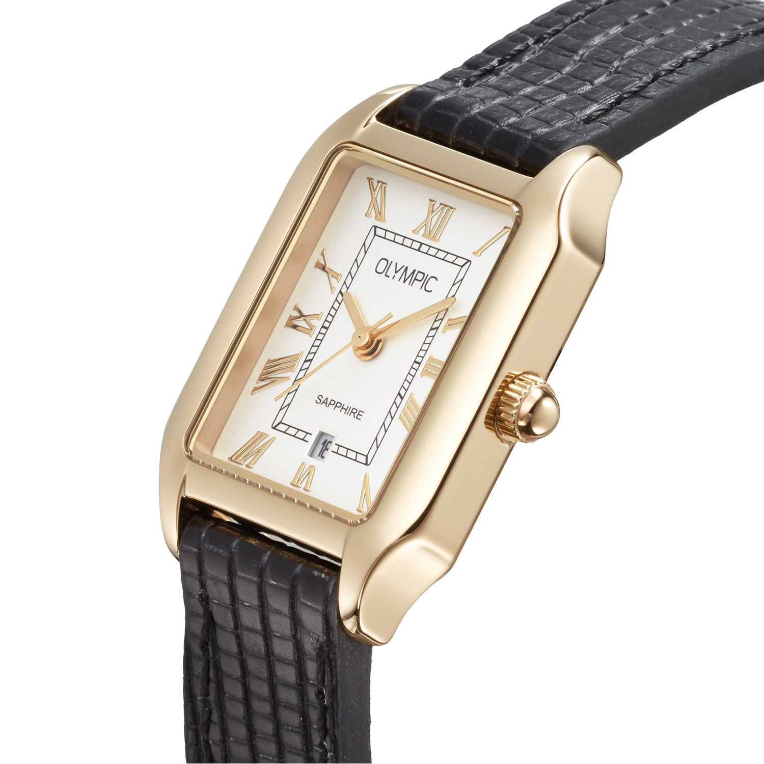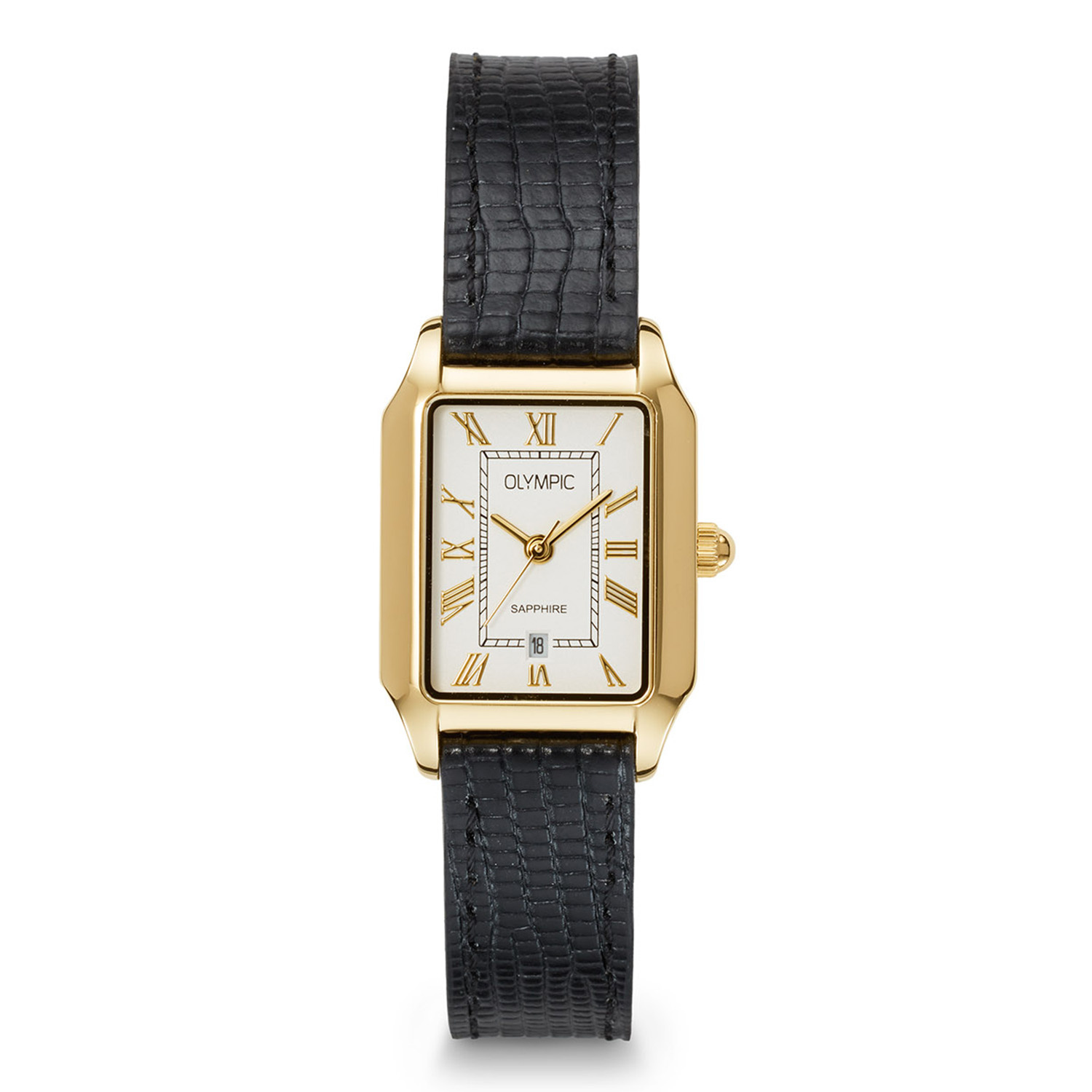 Dit unieke Olympic horloge met artikelnummer: OL73DDL001 is een chique dameshorloge. Het horloge heeft een ronde goudkleurige stalen kast met een diameter van 33 mm. De witte wijzerplaat met datumaanduiding en met Romeinse cijfers zorgt samen met de verzorgde afwerking voor een stijlvolle uitstraling. De zwart leren band draagt comfortabel en maakt het ontwerp helemaal af.
