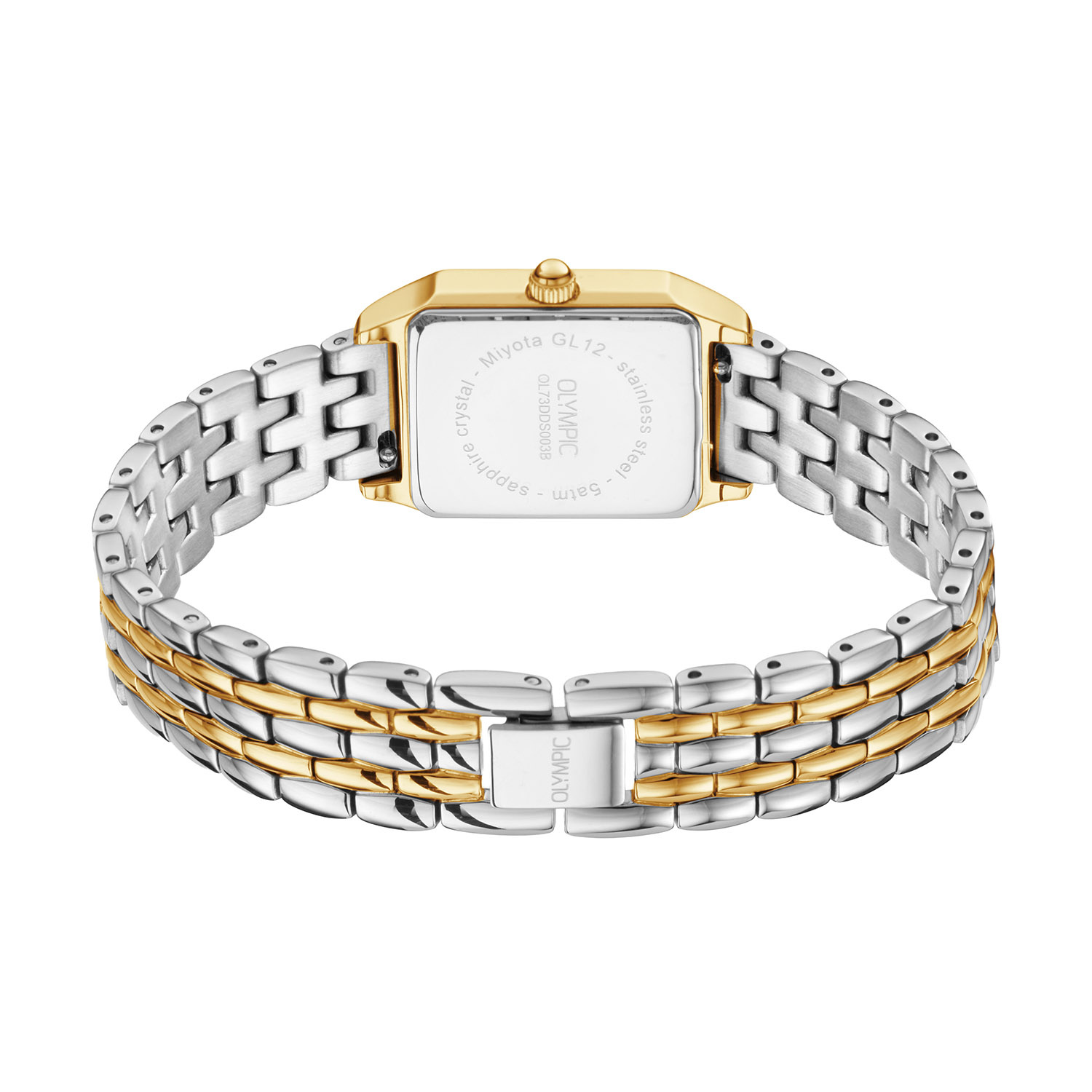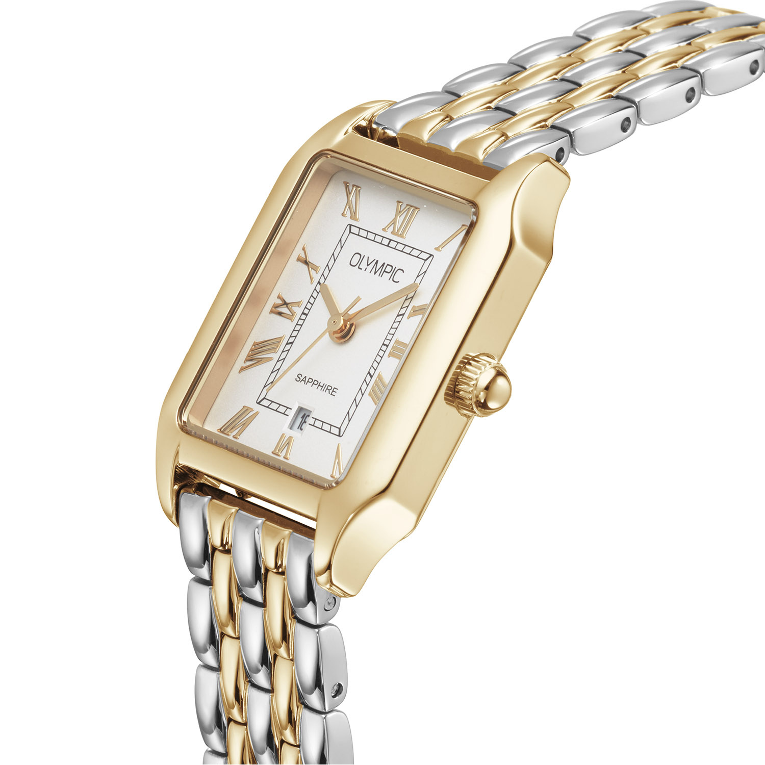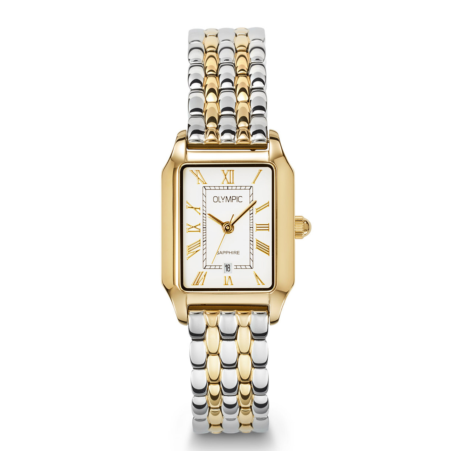 Dit unieke Olympic horloge met artikelnummer: OL73DDS003B is een chique dameshorloge. Het horloge heeft een ronde goudkleurige stalen kast met een diameter van 33 mm. De witte wijzerplaat met datumaanduiding en met Romeinse cijfers zorgt samen met de verzorgde afwerking voor een stijlvolle uitstraling. De stalen schakelband draagt comfortabel en maakt het ontwerp helemaal af.