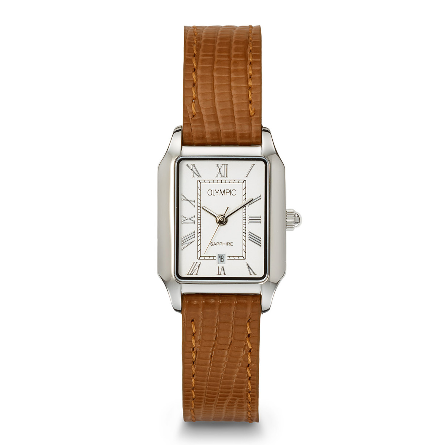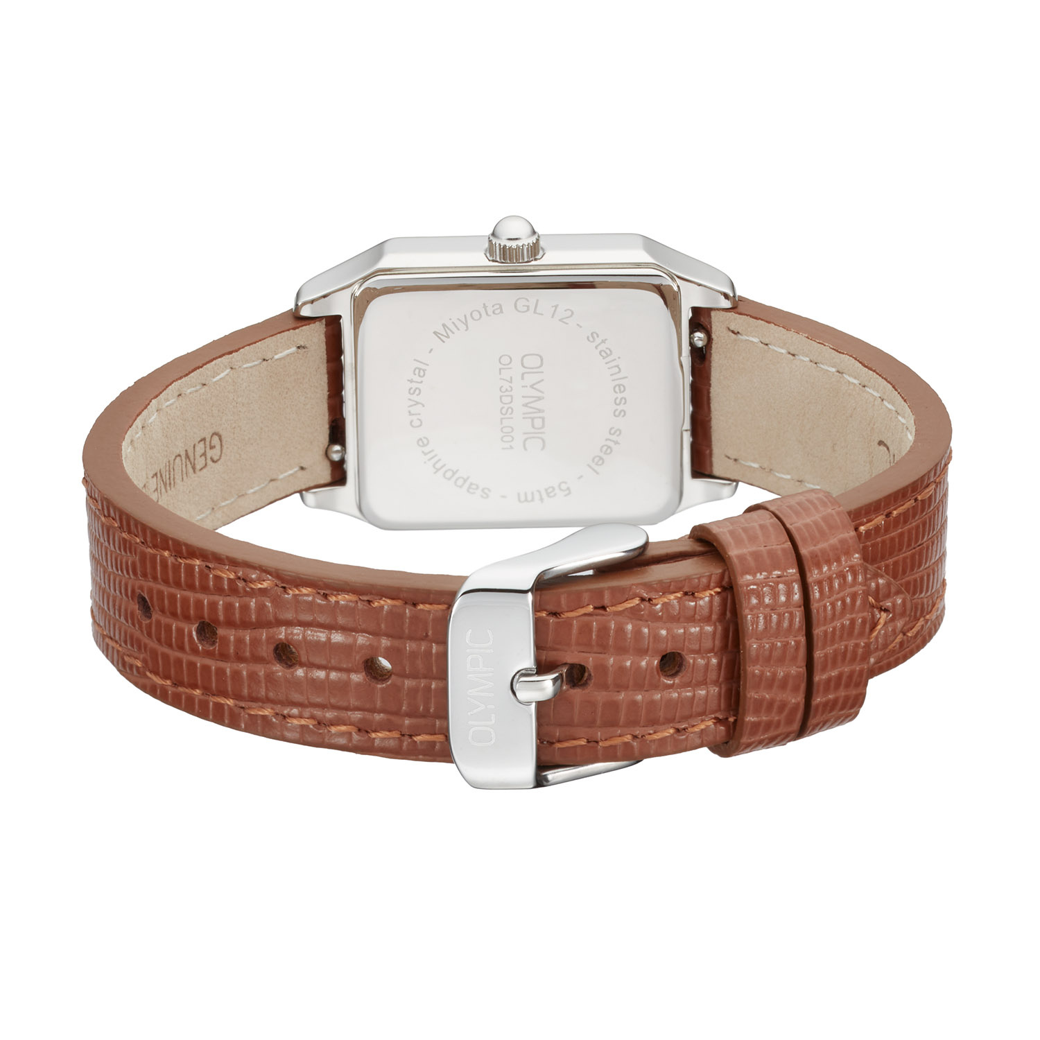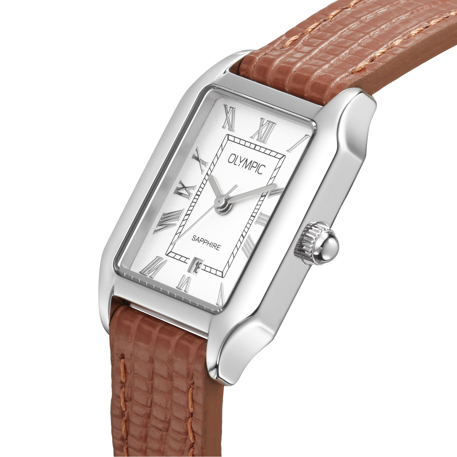 Dit unieke Olympic horloge met artikelnummer: OL73DSL001 is een chique dameshorloge. Het horloge heeft een ronde stalen kast met een diameter van 33 mm. De witte wijzerplaat met datumaanduiding en met Romeinse cijfers zorgt samen met de verzorgde afwerking voor een stijlvolle uitstraling. De bruin leren band draagt comfortabel en maakt het ontwerp helemaal af.