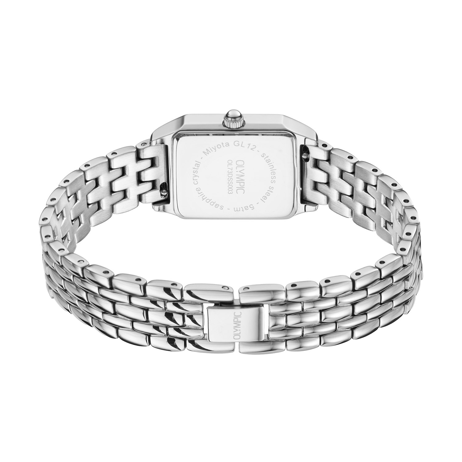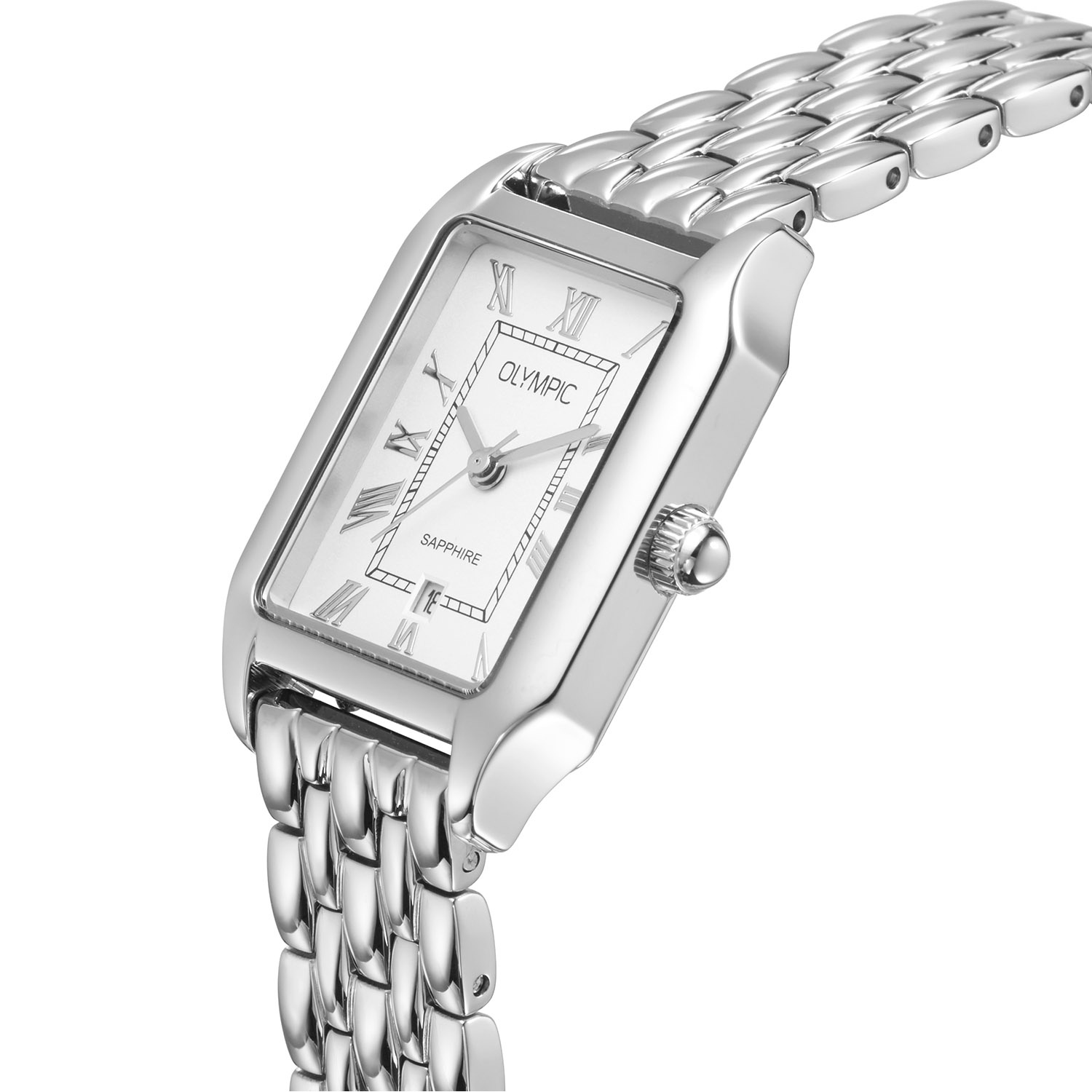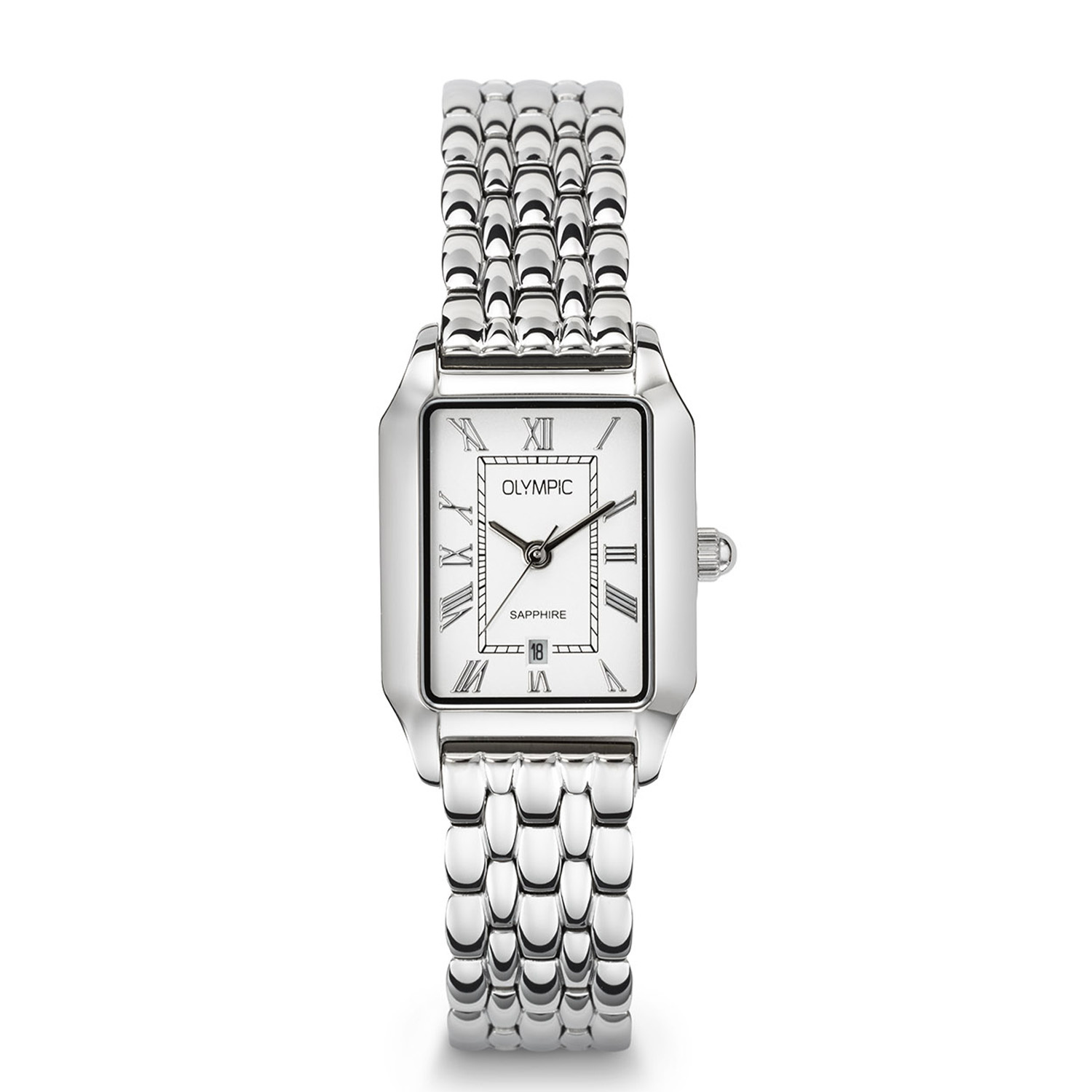 Dit unieke Olympic horloge met artikelnummer: OL73DSS003 is een chique dameshorloge. Het horloge heeft een ronde stalen kast met een diameter van 33 mm. De witte wijzerplaat met datumaanduiding en met Romeinse cijfers zorgt samen met de verzorgde afwerking voor een stijlvolle uitstraling. De stalen schakelband draagt comfortabel en maakt het ontwerp helemaal af.