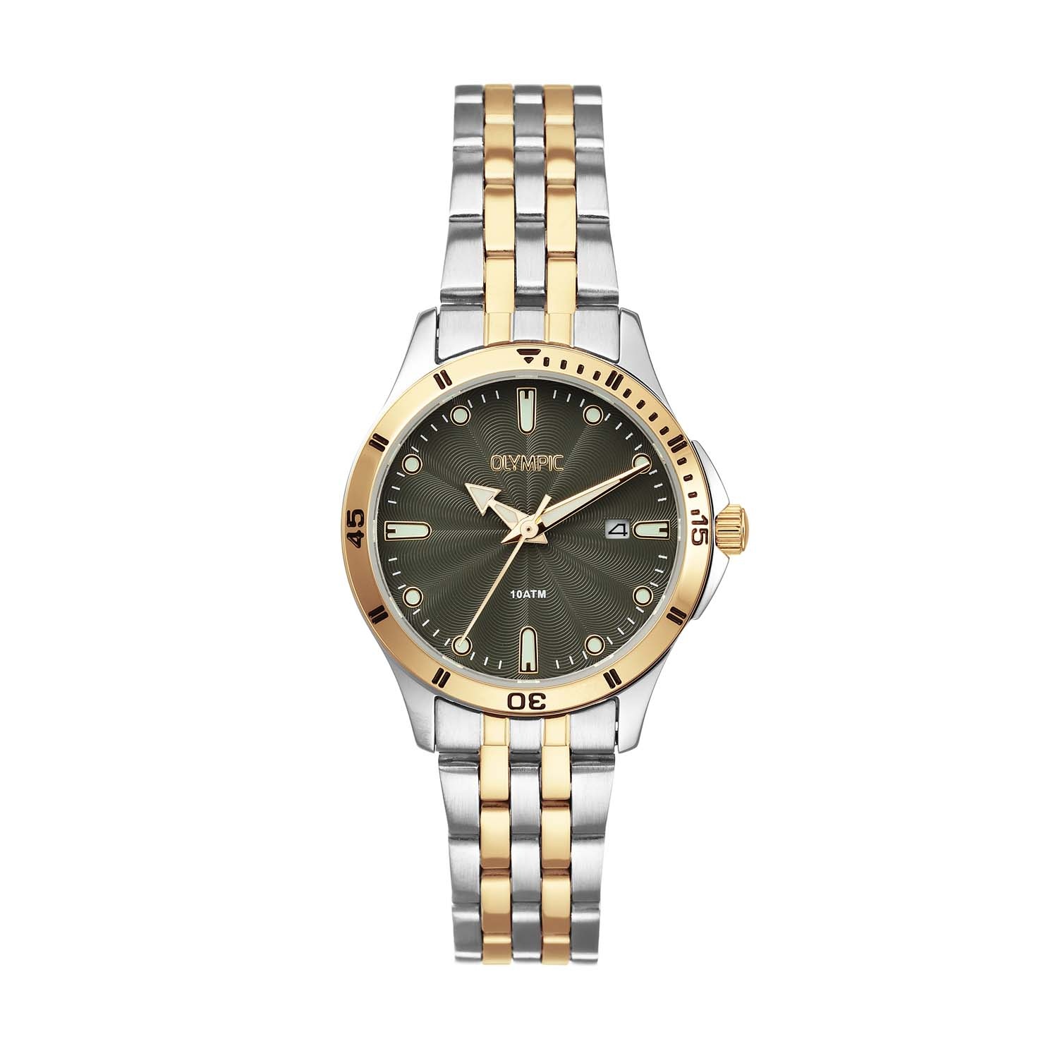 Dit unieke Olympic horloge met artikelnummer: OL72DSS113B is een dameshorloge met een classic sportieve uitstraling. Het horloge heeft een ronde stalen kast met een goudkleurige bezel, een groene wijzerplaat met een datum, witte strepen en stippen ingelegd met lumibrite. Aan de kast zit een stalen bicolor schakelband met vouwsluiting. Het horloge heeft een mineraalglas, een doorsnee van 28mm en is 10ATM.