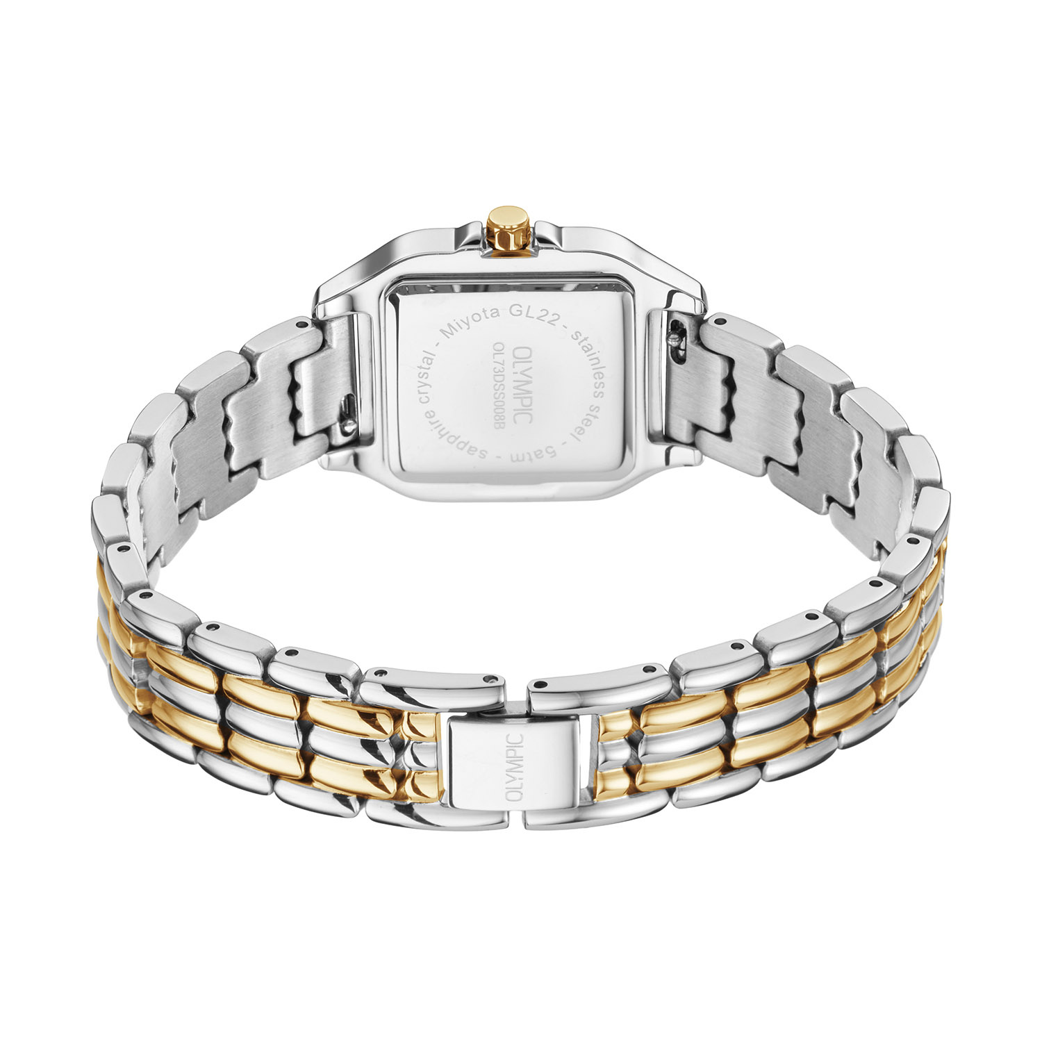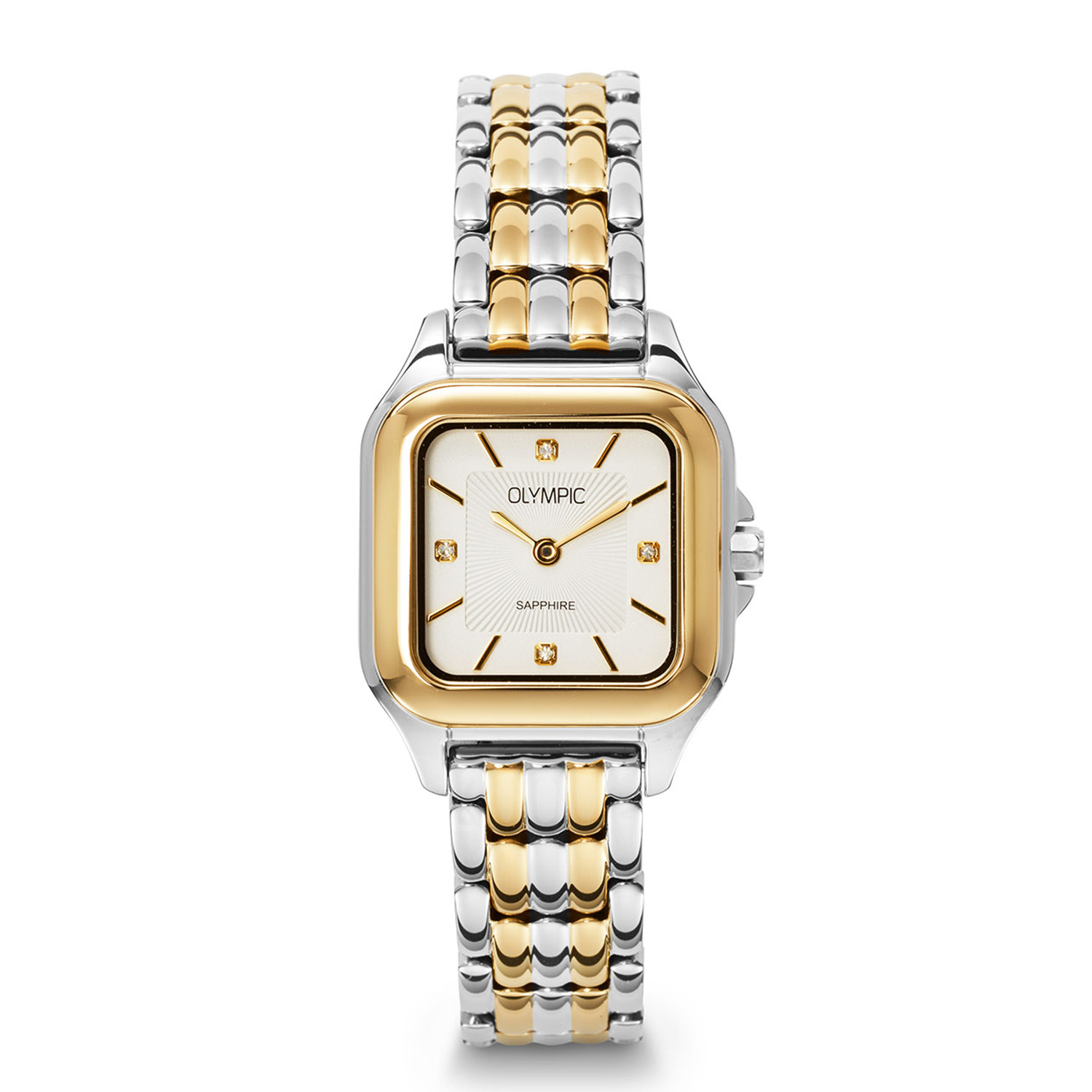 Dit unieke Olympic horloge met artikelnummer: OL73DSS008B is een stijlvol dameshorloge. Het horloge heeft een vierkante bicolor stalen kast met een diameter van 26 mm. De witte wijzerplaat zorgt samen met een elegante mix van klassiek en modern voor een verzorgde uitstraling. De bicolor schakelband draagt comfortabel en maakt het ontwerp helemaal af.