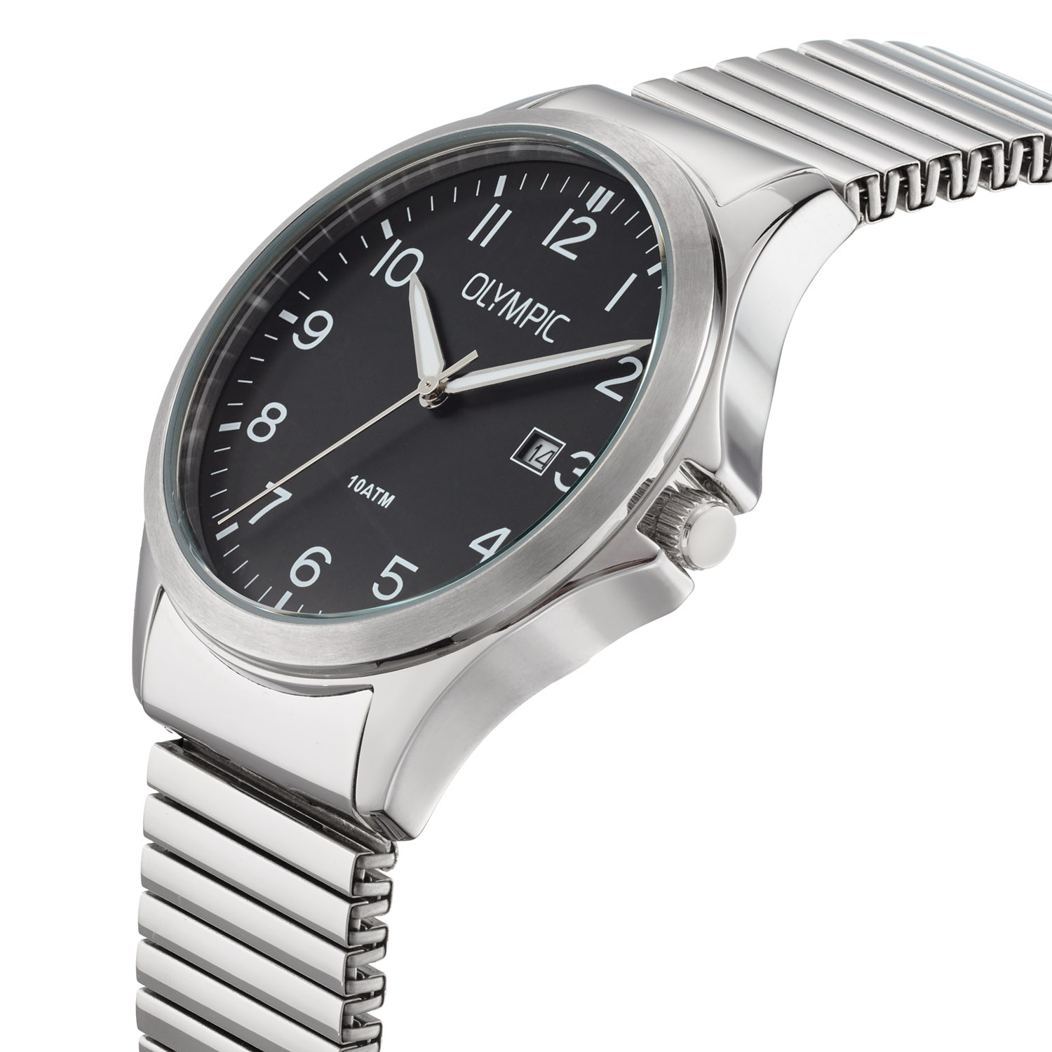 Dit unieke Olympic horloge met artikelnummer OL72HSS410 is een herenhorloge met een classic sportieve uitstraling. Het horloge heeft een ronde stalen kast met een zwarte wijzerplaat met een datum. Aan de kast zit een stalen rekband. Het horloge heeft een mineraalglas, een doorsnee van 47 mm en is 10 ATM.