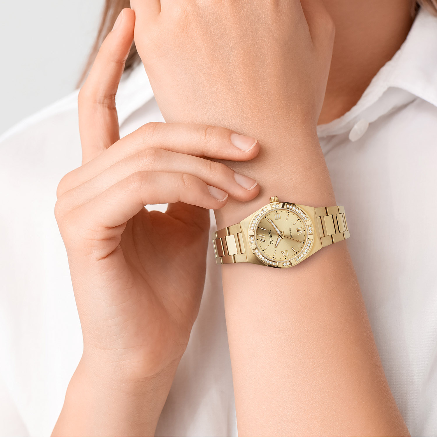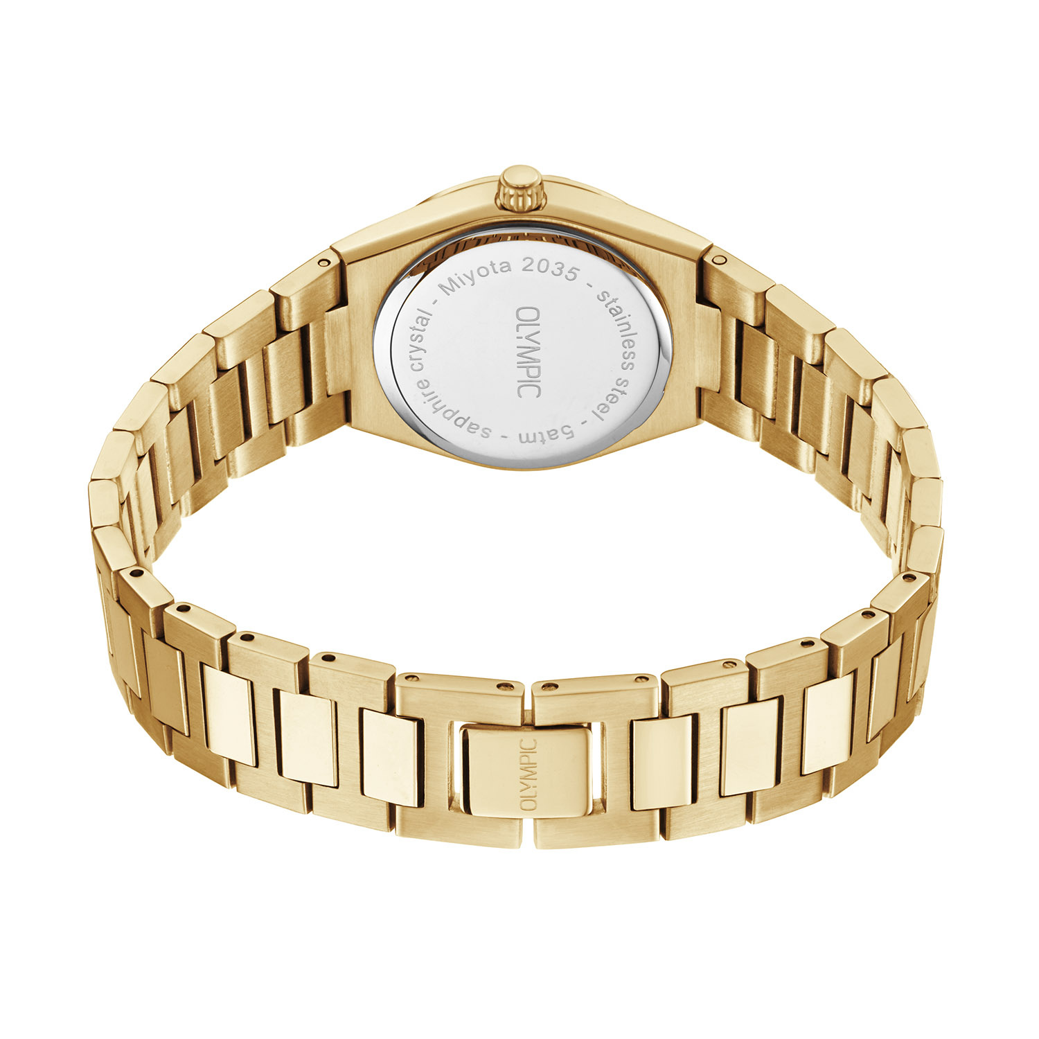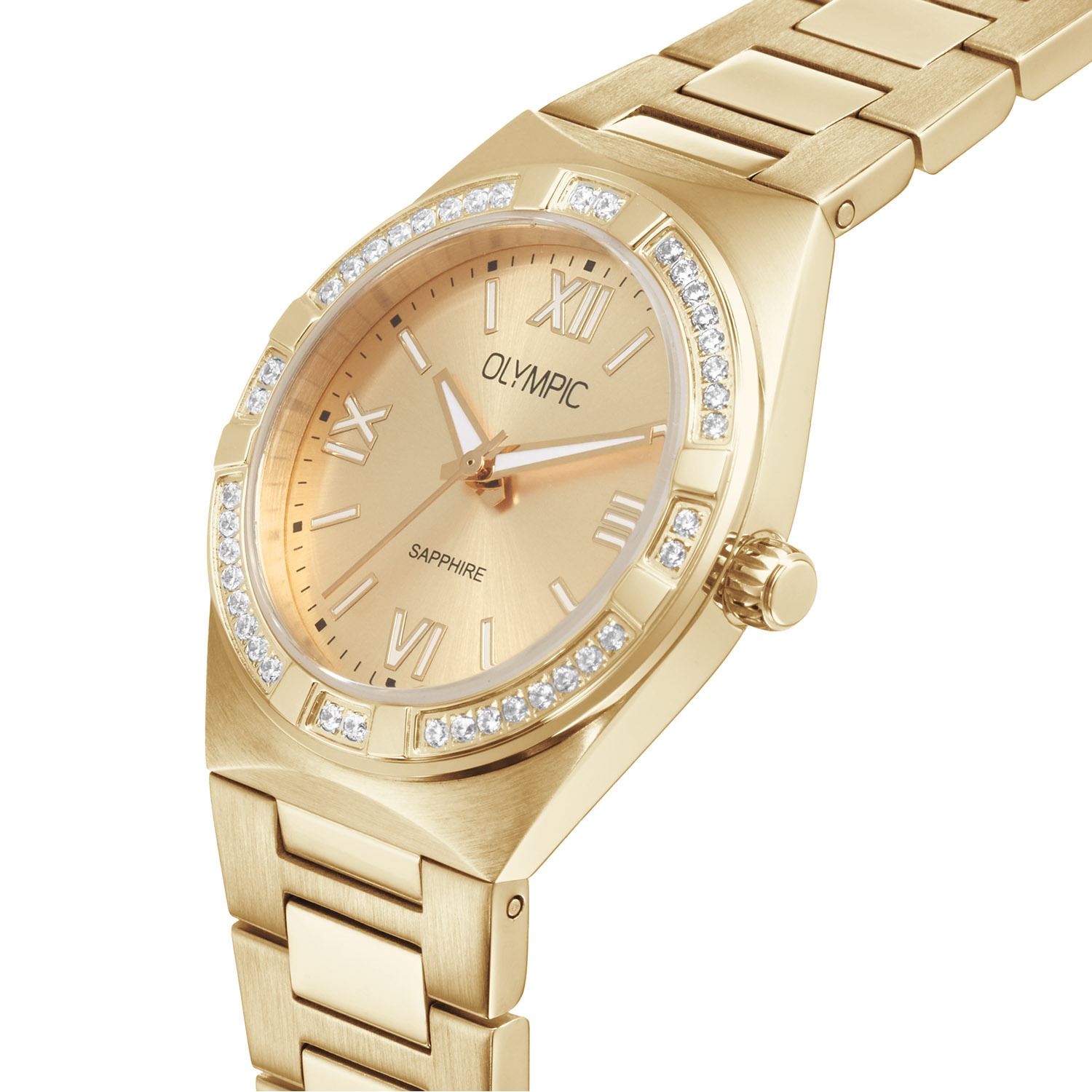 Dit unieke Olympic horloge met artikelnummer: OL73DDD002 is een stijlvol dameshorloge. Het horloge heeft een ronde goudkleurige stalen kast met een diameter van 29 mm. De goudkleurige wijzerplaat zorgt samen met sprankelende kristallen details en een chique uitstraling voor een verzorgde uitstraling. De goudkleurige schakelband draagt comfortabel en maakt het ontwerp helemaal af.