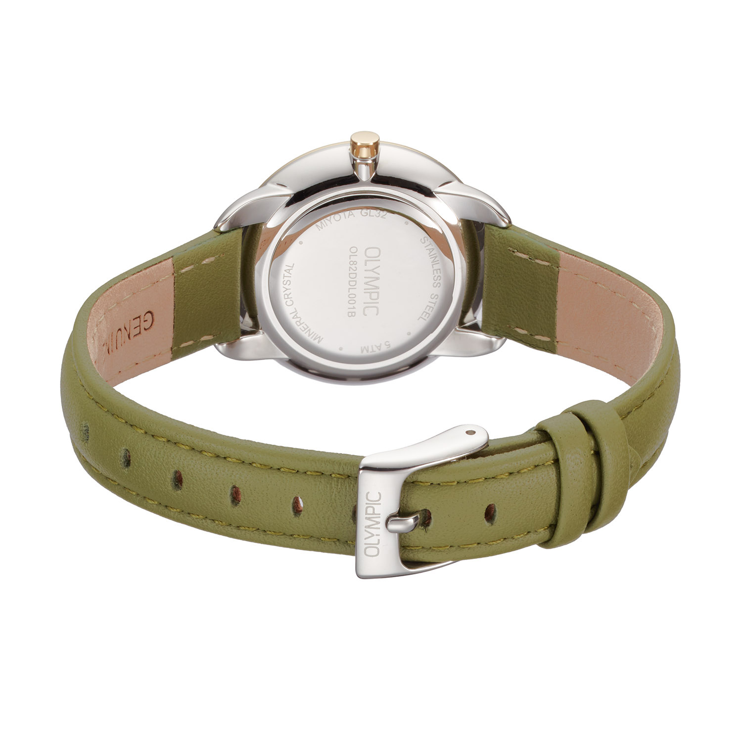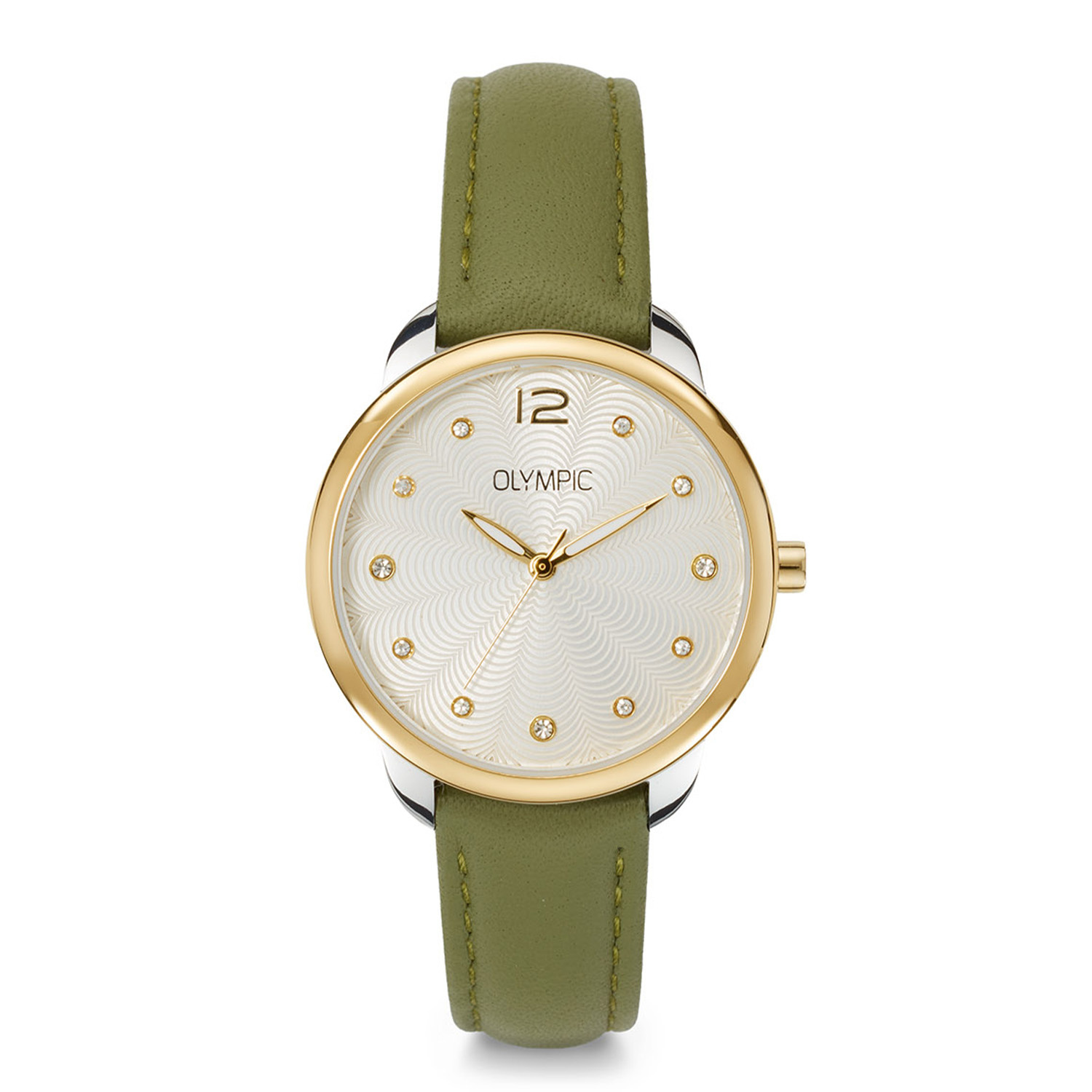 Dit unieke Olympic horloge met artikelnummer: OL82DDL001B is een stijlvol dameshorloge. Het horloge heeft een ronde bicolor stalen kast met een diameter van 31 mm. De zilverkleurige wijzerplaat met geometrisch patroon zorgt samen met kristallen indexen en een modieuze uitstraling voor een verzorgde uitstraling. De groene leren band draagt comfortabel en maakt het ontwerp helemaal af.