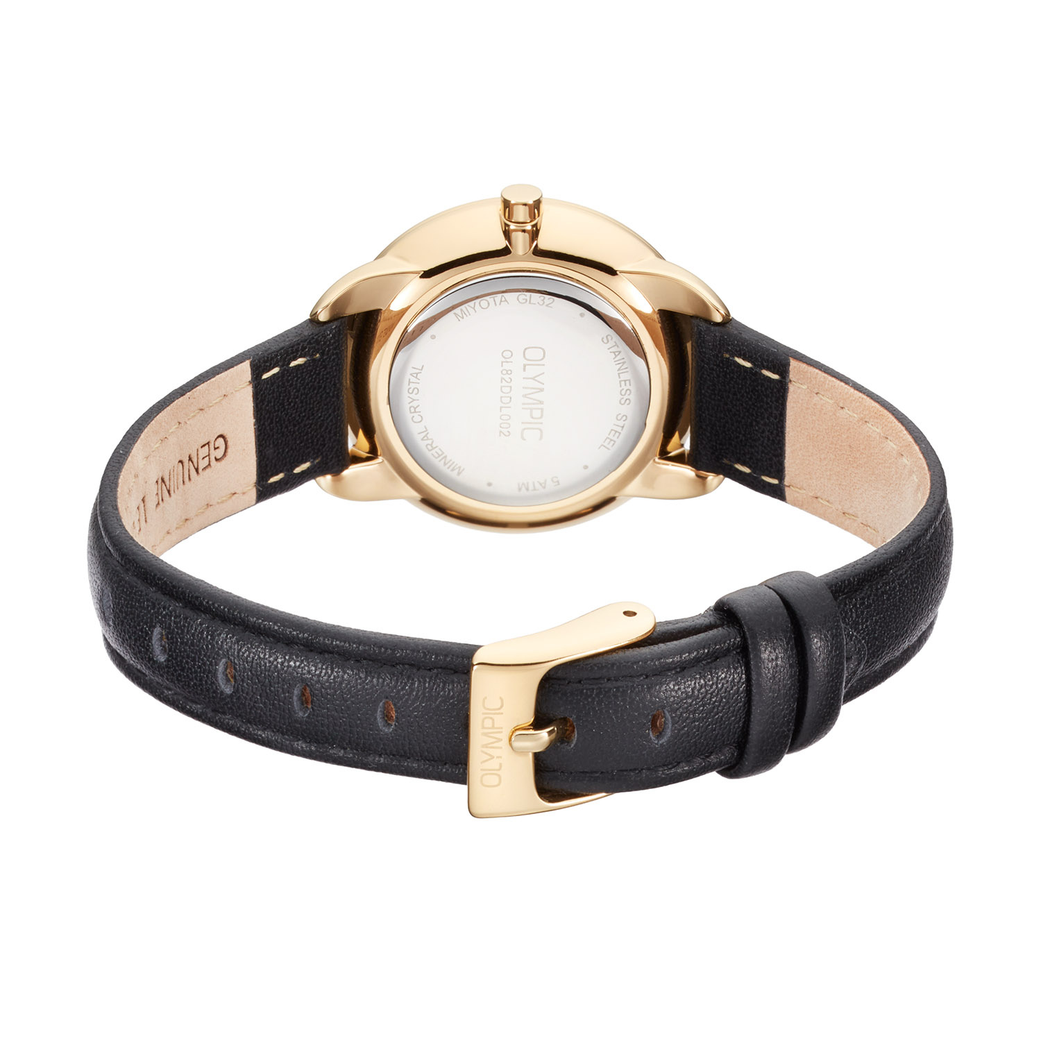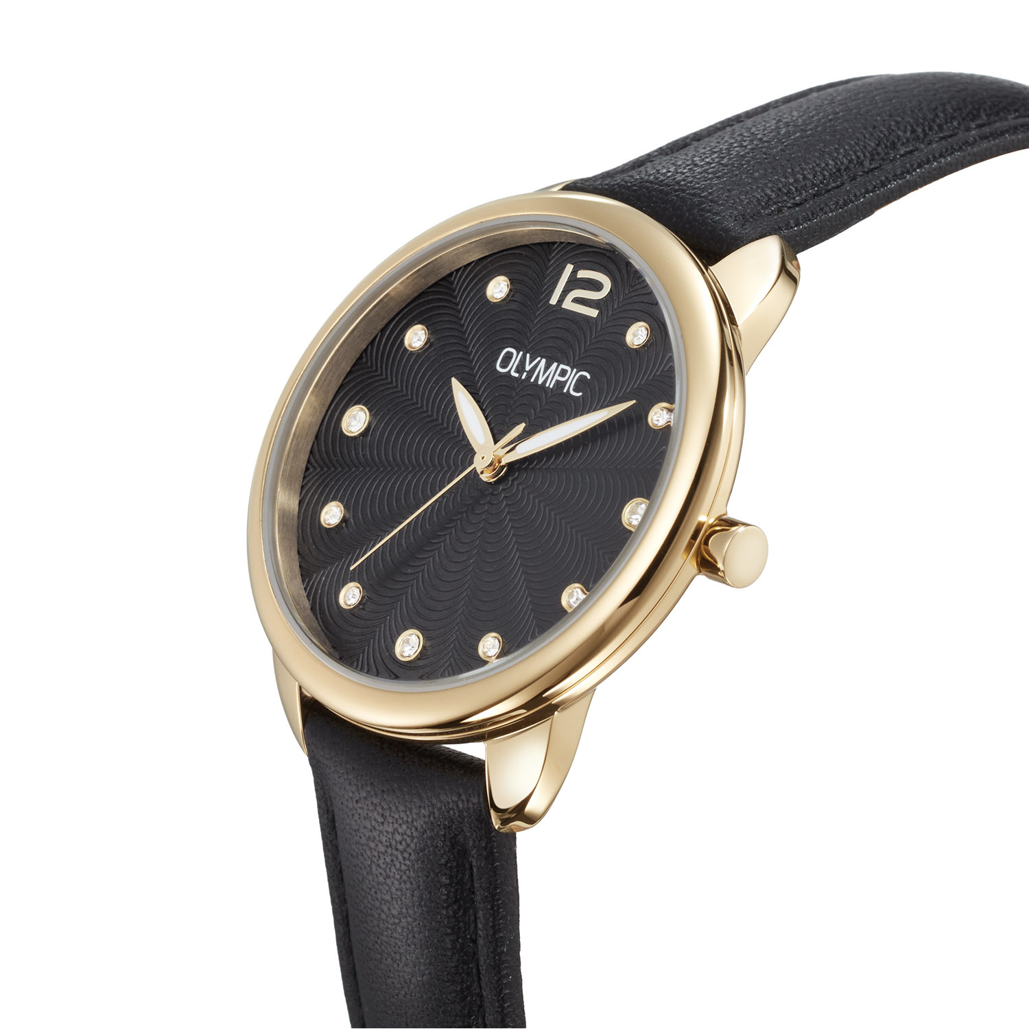 Dit unieke Olympic horloge met artikelnummer: OL82DDL002 is een stijlvol dameshorloge. Het horloge heeft een ronde goudkleurige stalen kast met een diameter van 31 mm. De zwarte wijzerplaat met kristallen details zorgt samen met een chique en eigentijdse look voor een verzorgde uitstraling. De zwarte leren band draagt comfortabel en maakt het ontwerp helemaal af.