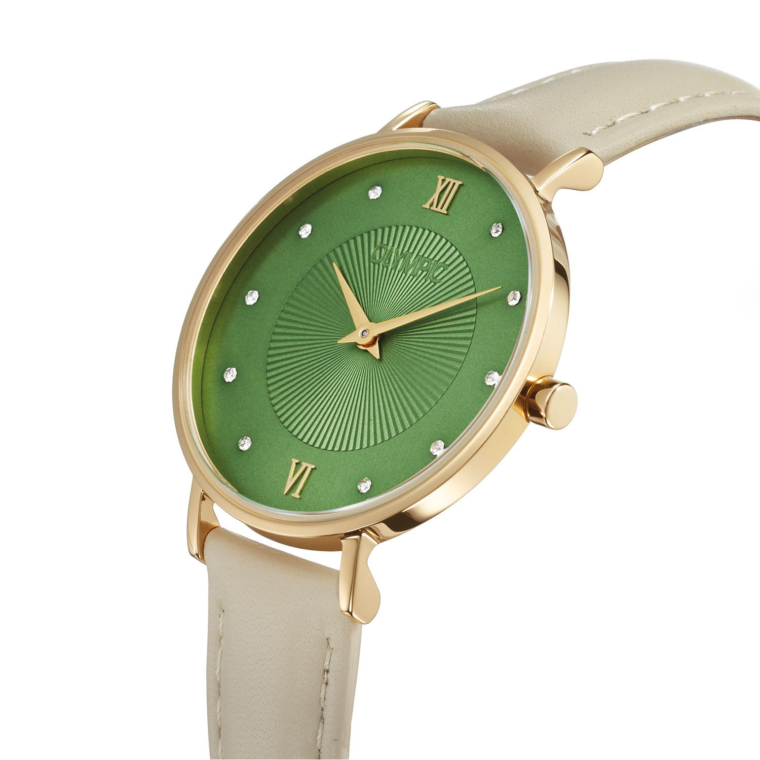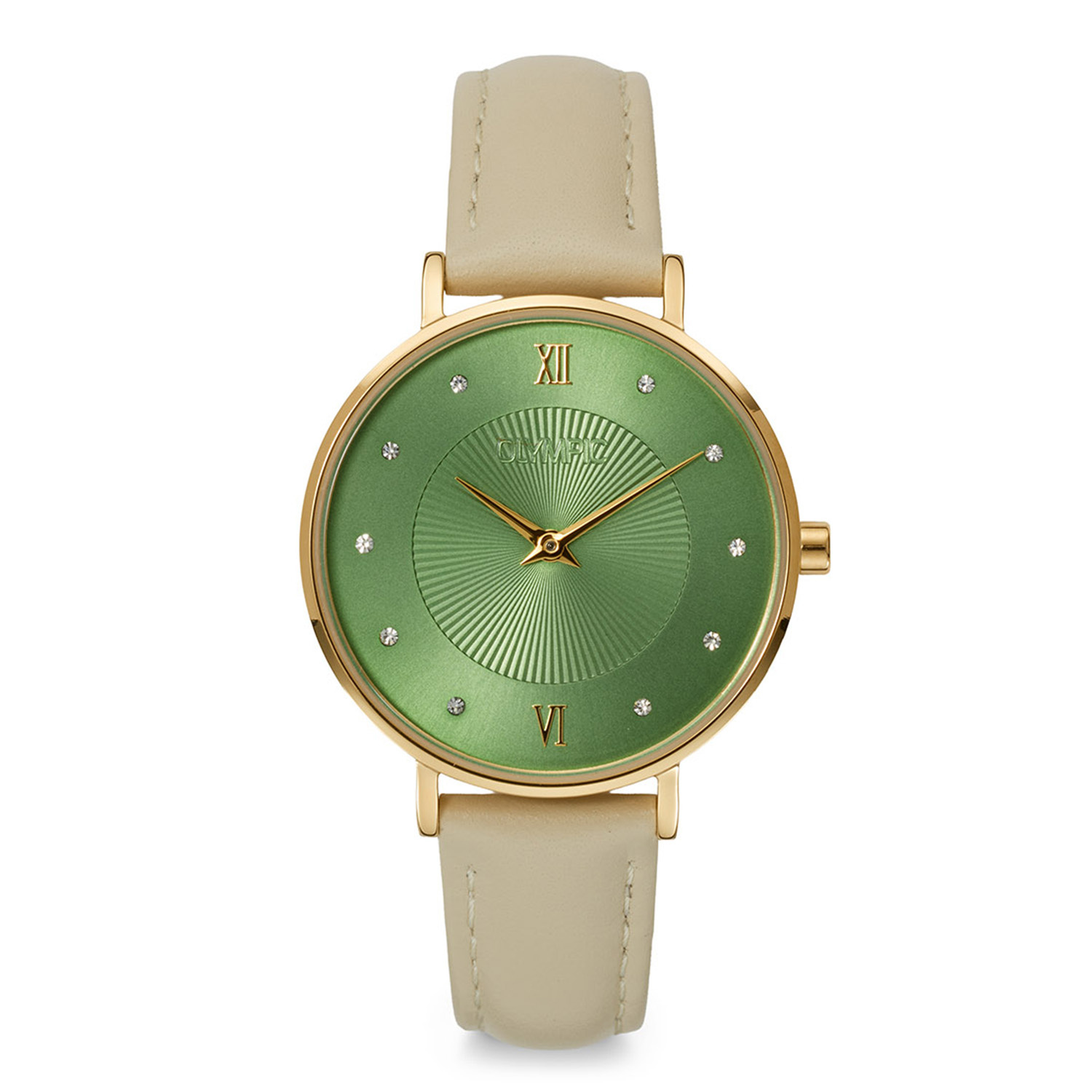 Dit unieke Olympic horloge met artikelnummer: OL1DDL002 is een stijlvol dameshorloge. Het horloge heeft een ronde goudkleurige stalen kast met een diameter van 32 mm. De felgroene wijzerplaat met kristallen indexen zorgt samen met een opvallende, zomerse uitstraling voor een verzorgde uitstraling. De beige leren band draagt comfortabel en maakt het ontwerp helemaal af.