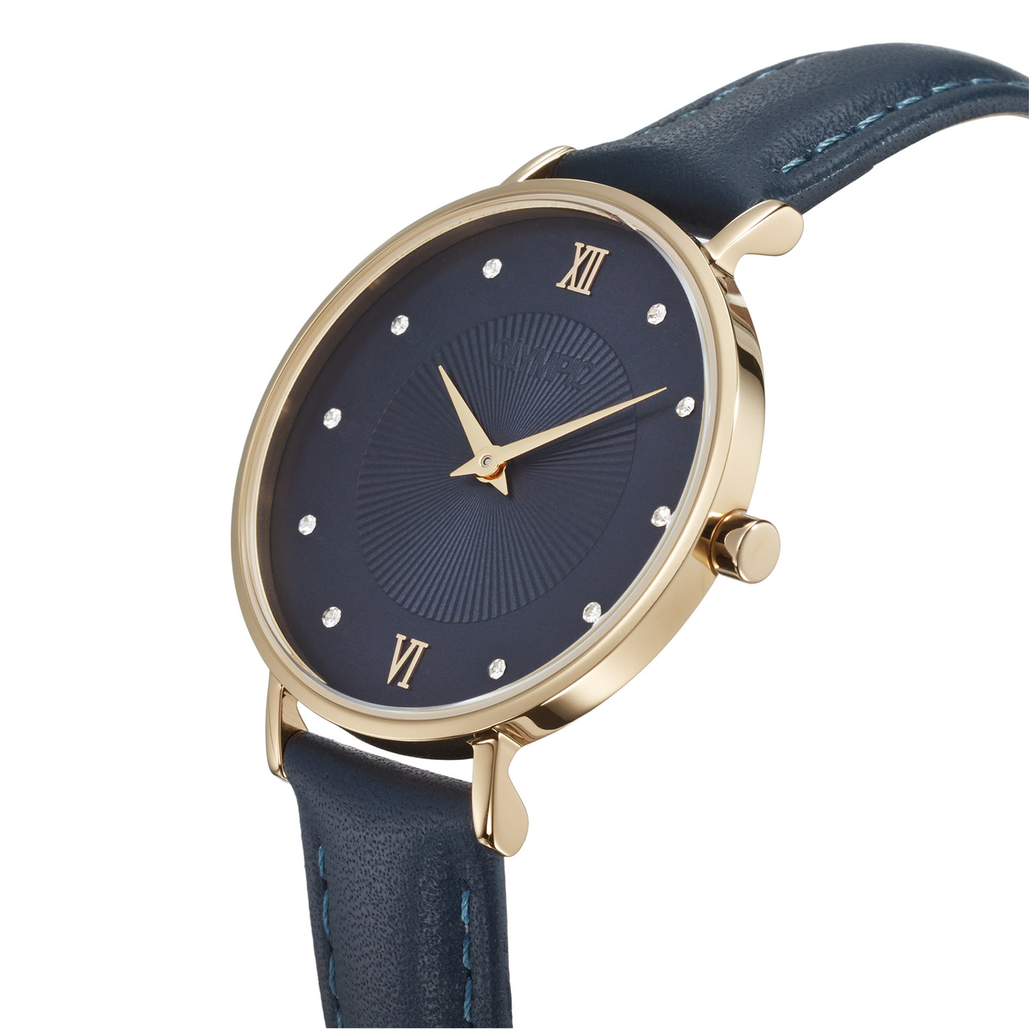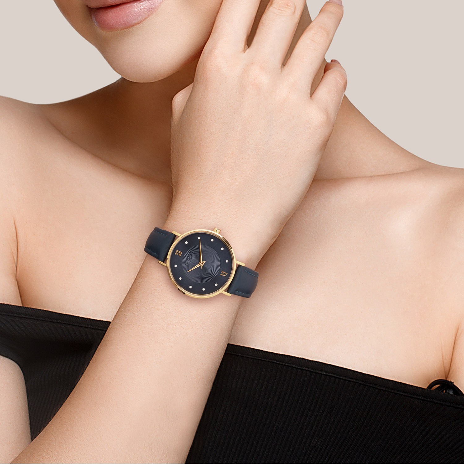 - Donkerblauwe wijzerplaat met kristallen details