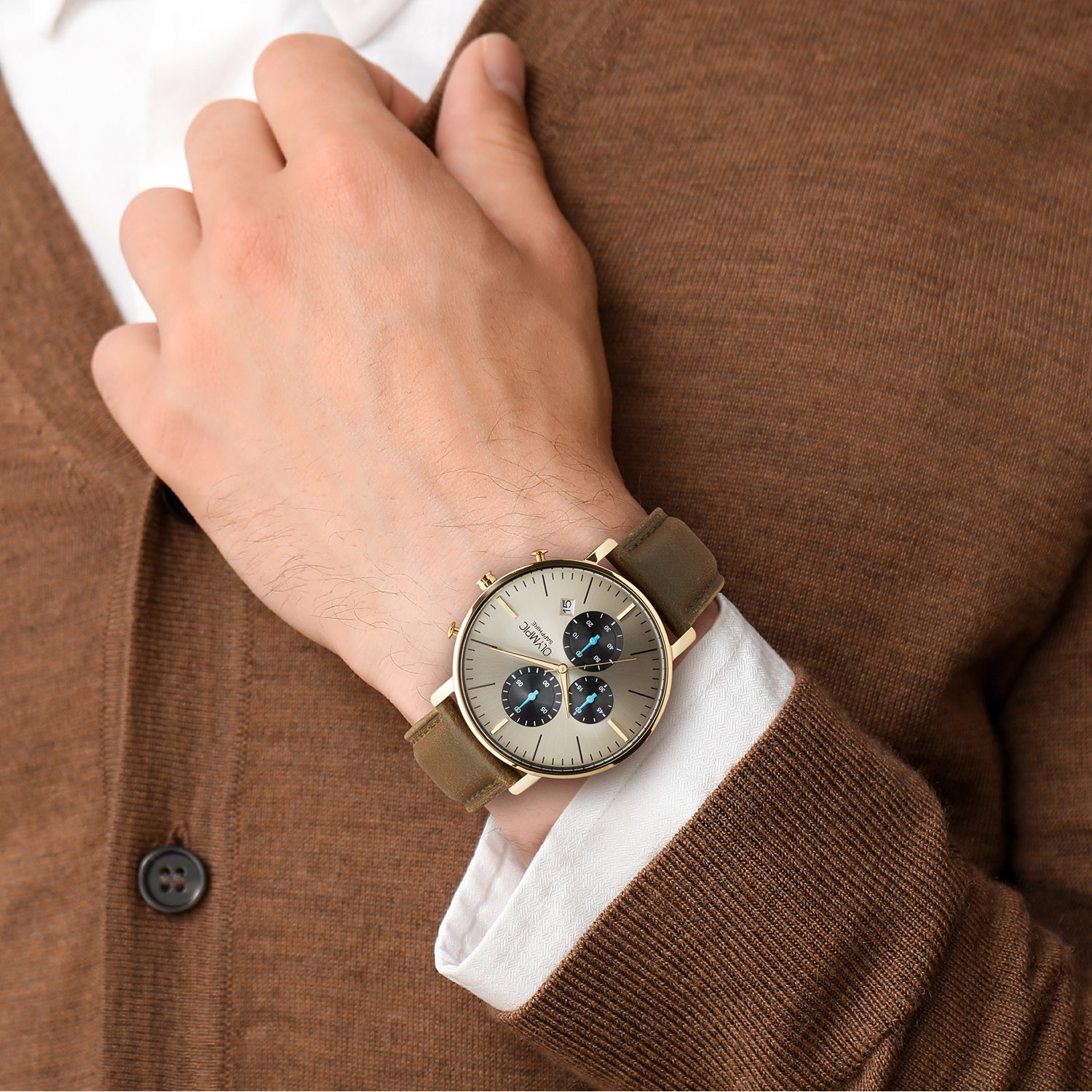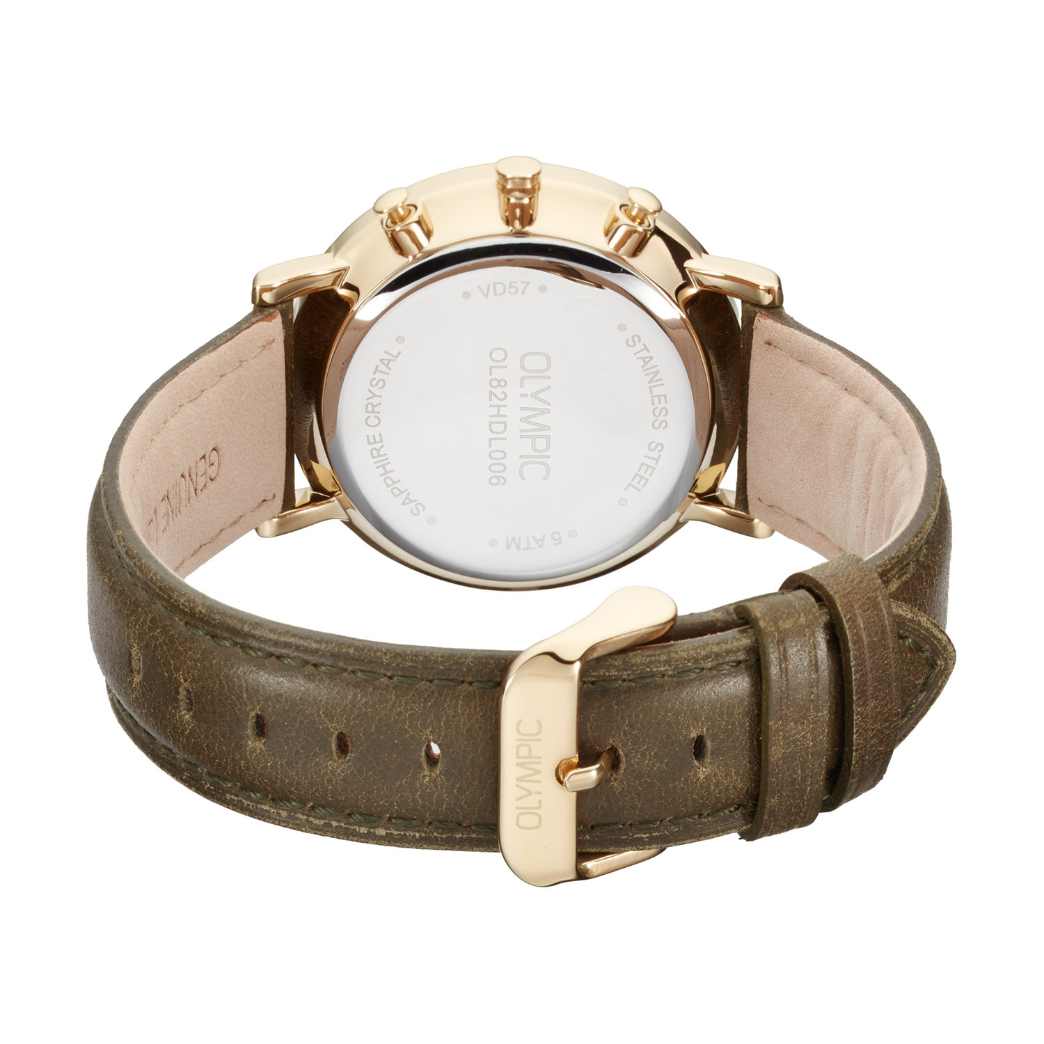 Dit unieke Olympic horloge met artikelnummer: OL82HDL006 is een stijlvol herenhorloge. Het horloge heeft een ronde goudkleurige stalen kast met een diameter van 40 mm. De grijze wijzerplaat zorgt samen met chronograafdetails, datumweergave en een opvallende look voor een verzorgde uitstraling. De groene leren band draagt comfortabel en maakt het ontwerp helemaal af.