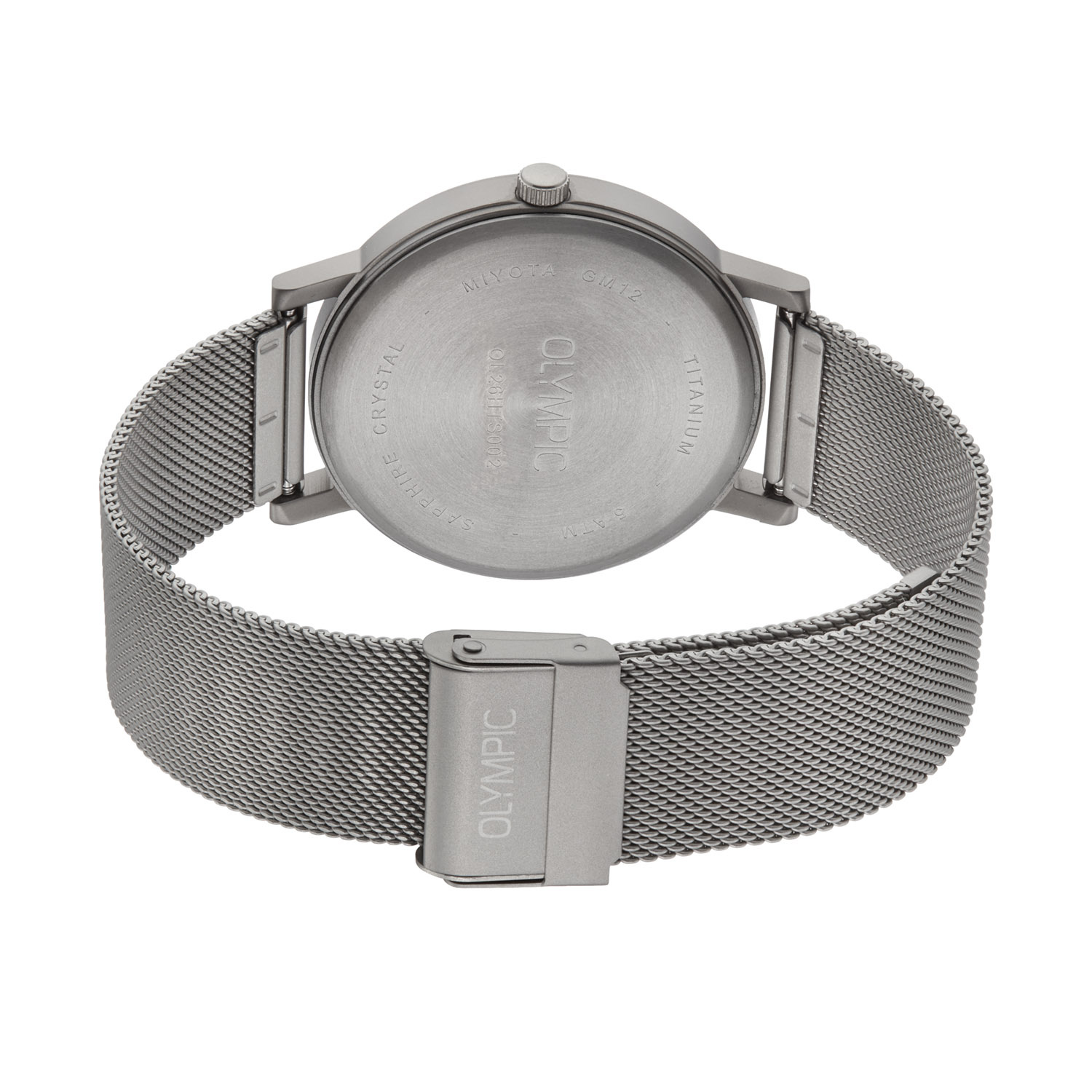 Dit unieke Olympic horloge met artikelnummer OL26HTS002 is een herenhorloge met een classic sportieve uitstraling. Het horloge heeft een ronde titanium kast met een grijze wijzerplaat met een datum. Aan de kast zit een stalen milanese band met een druksluiting. Het horloge heeft een saffierglas, een doorsnee van 40 mm en is 5 ATM.