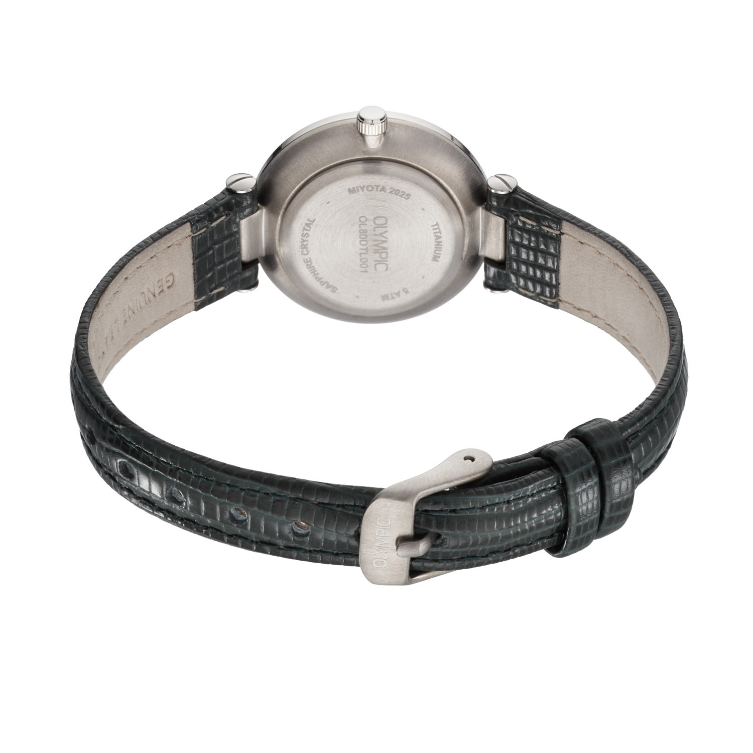 Dit unieke Olympic horloge met artikelnummer OL80DTL001 is een dameshorloge met een classic sportieve uitstraling. Het horloge heeft een ronde titanium kast met een glanzende bezel en een zilverkleurige sunray wijzerplaat met zilverkleurige uursaanduiding. Met een speciale aanzet is de donkergrijze band aan de kast bevestigd. Het horloge heeft een saffierglas, een doorsnee van 28 mm en is 5 ATM.